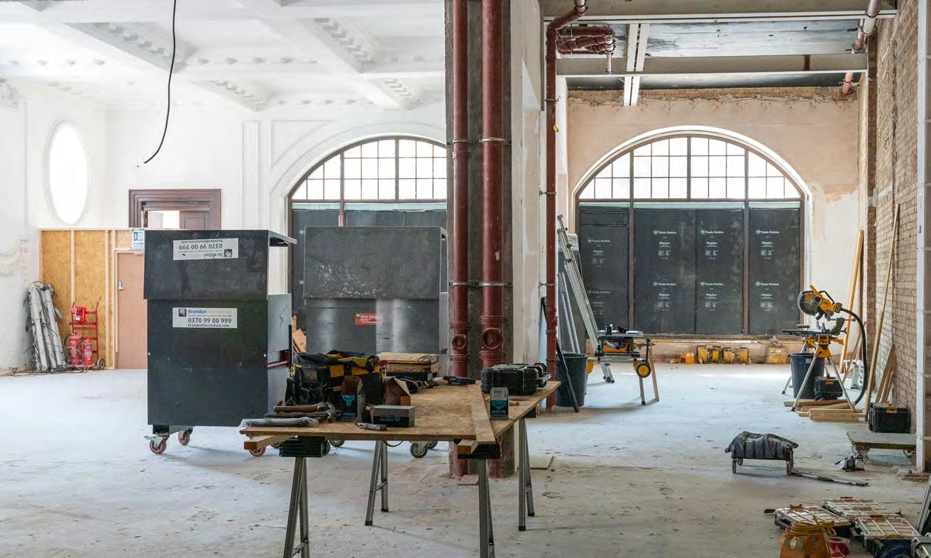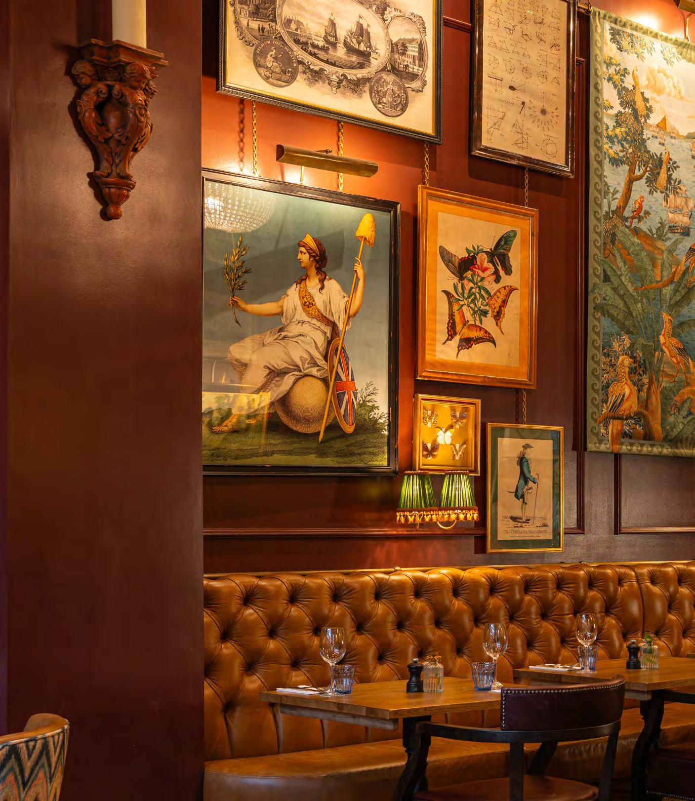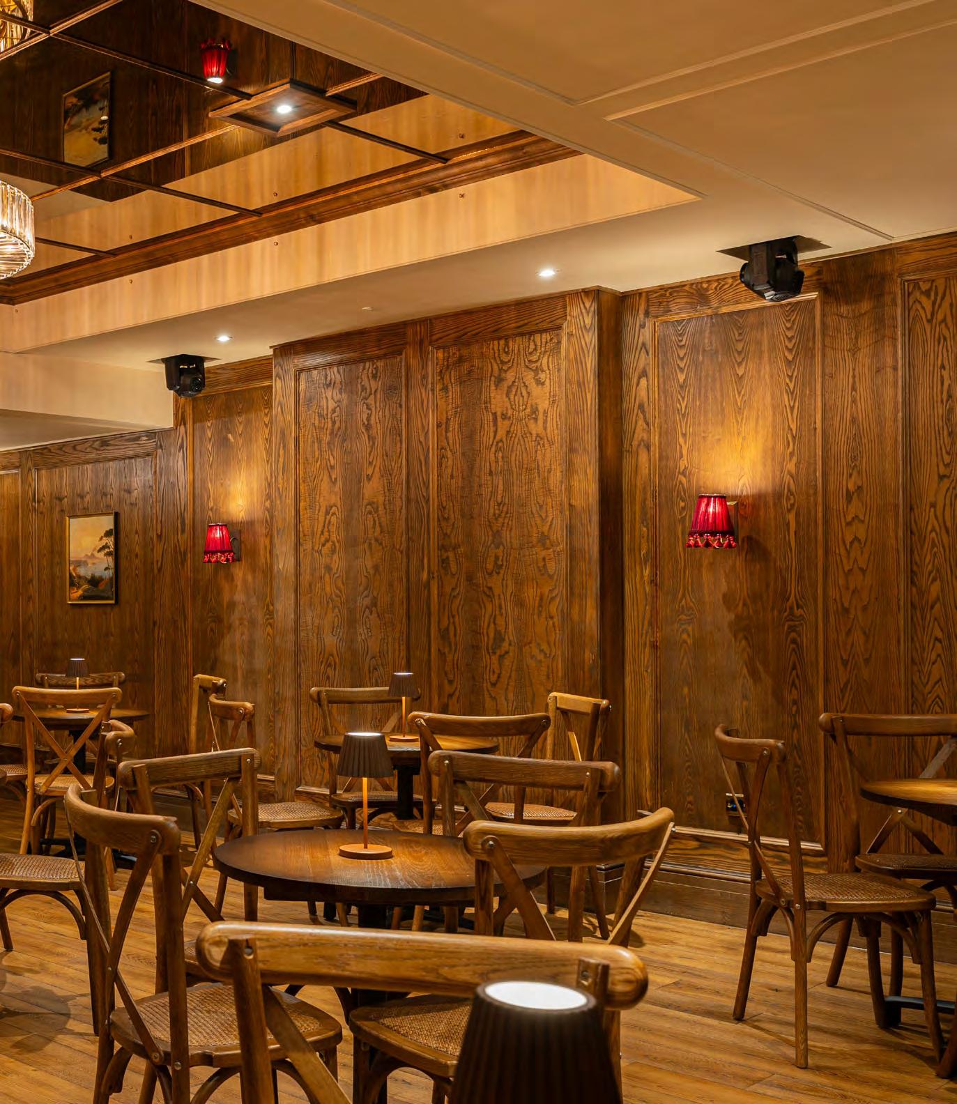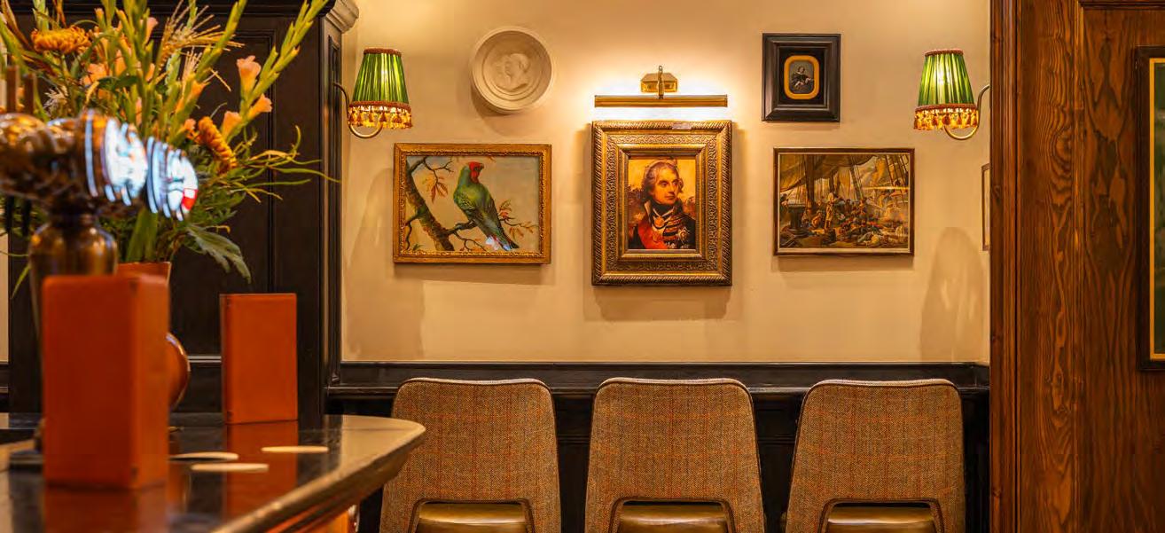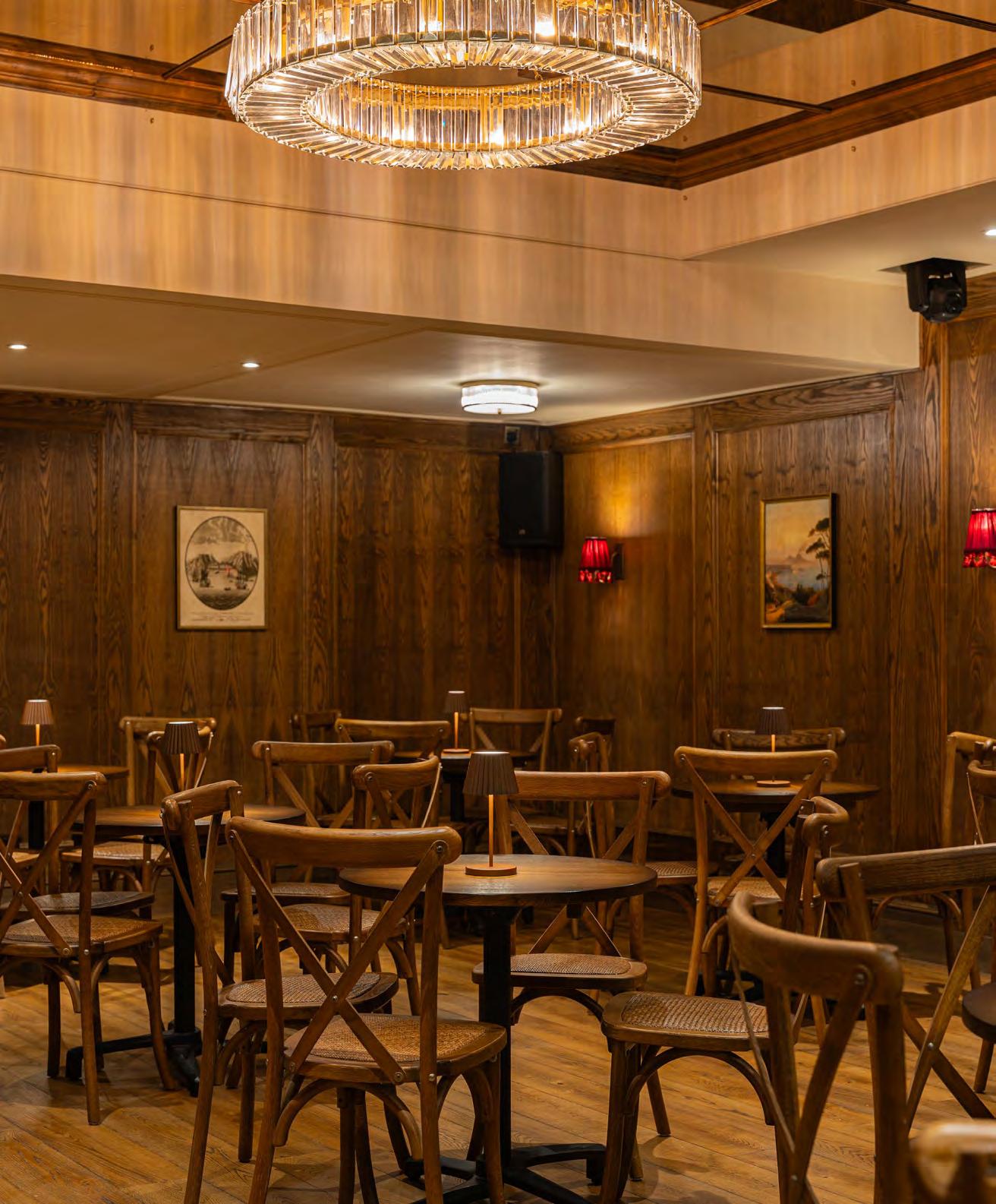 As guests enter through the main lobby into the Old Banking Hall, a space defined by its impressive five-metre-high agedbronze ceilings, four grand chandeliers and bespoke wallpaper framed by original festoon plasterwork. Vintage artwork, historic banking documents and oversized feature lamps create an atmosphere that feels both elegant and timeless. Restored Georgian windows and ornate plaster detailing sit harmoniously alongside the warm new interior scheme, which introduces an impressive central bar, intimate booth seating, leather dining chairs and striking statement chandeliers. Together, these elements highlight the hall’s Edwardian character while offering a welcoming contemporary experience.