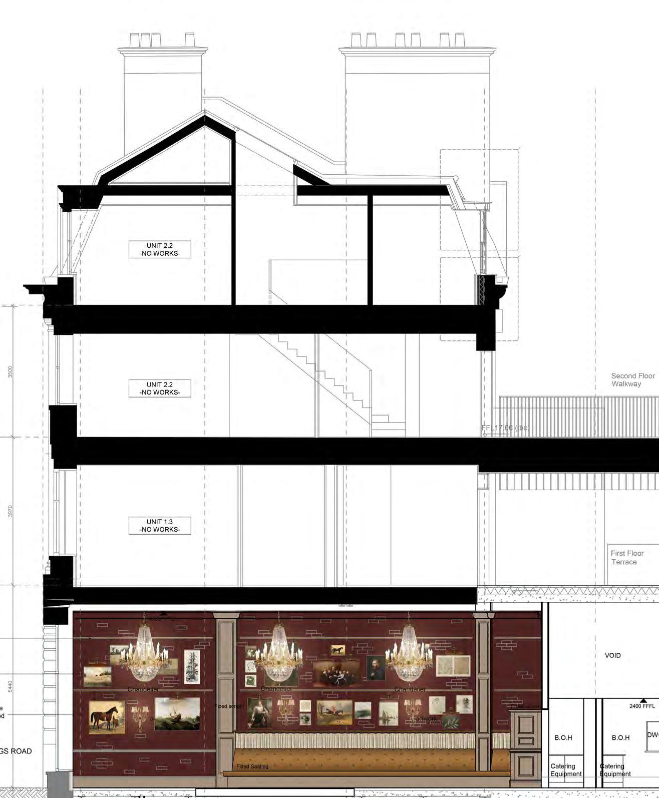 the ground floor space. Male and female WC facilities were provided on the lower ground floor, alongside a small bar area. The remaining areas were occupied by the kitchen, cellar, and ancillary staff facilities, all arranged to support the operational requirements of the venue. The lower ground floor incorporated the approved fire strategy and shared a means of escape with the residential units above, with exits leading onto Chelsea Manor Street or via the main entrance on King’s Road.