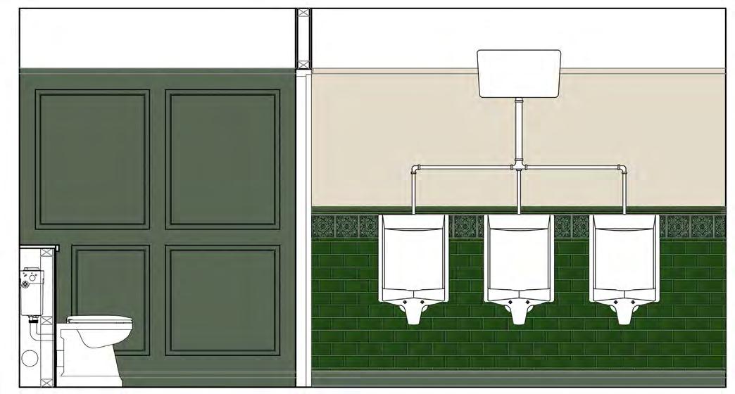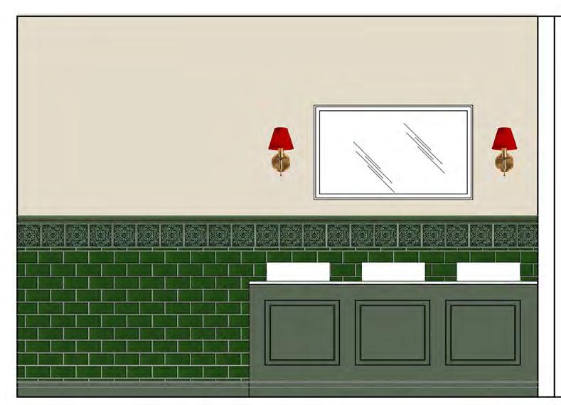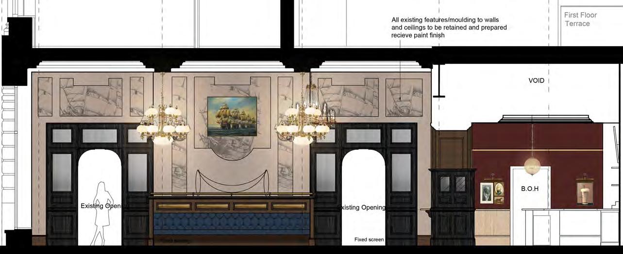 Entered directly from King’s Road, the ground floor comprised a newly designed internal entrance lobby, drinking and dining areas, and the main bar. A new dumbwaiter and passenger lift were installed, alongside ancillary back-ofhouse facilities including disabled WC provision. The layout had been carefully configured to minimize physical interventions within the historic banking hall, with back-of-house operations primarily located in the lower ground floor. This approach allowed the interior design to fully maximize the height and volume of the ground floor, enabling