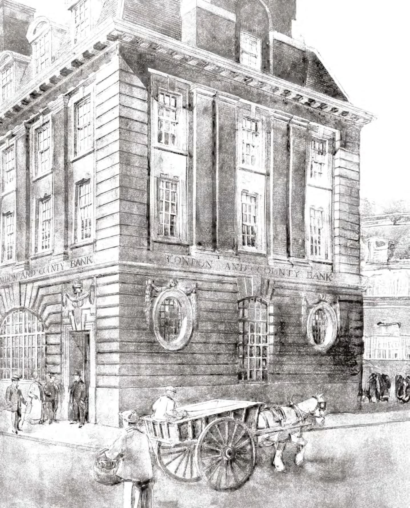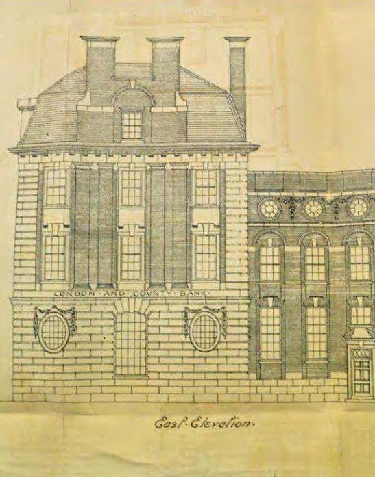 The existing building was constructed in 1909 to designs by Sir Reginald Blomfield, a leading Edwardian architect, for the London & County Bank. Its Edwardian Baroque style is expressed through a dignified stone façade, rusticated detailing, arched ground-floor openings, and restrained classical ornamentation.