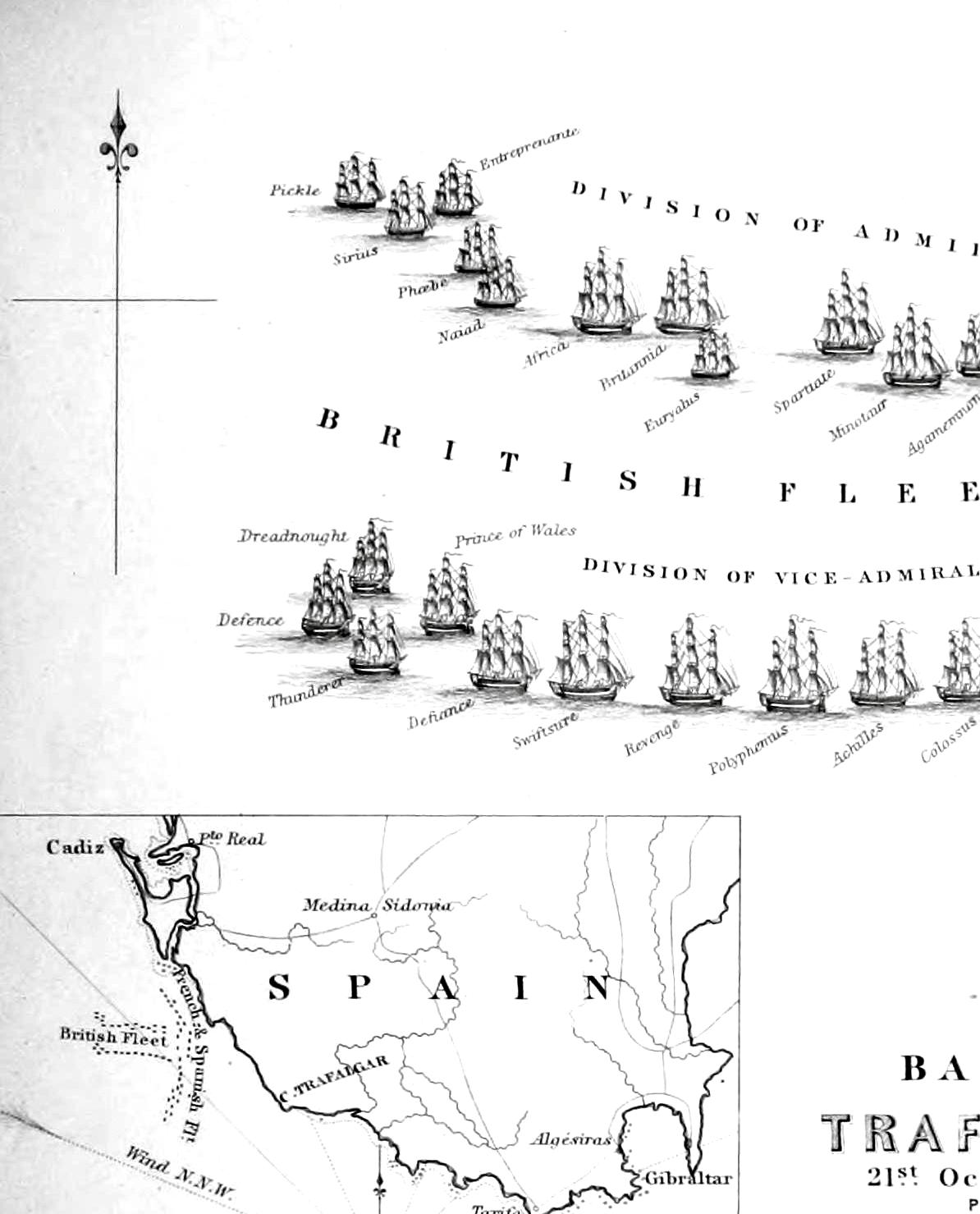 Fresh Breezes SSW and rainy. Communicated with Phoebe, Defence and Colossus, who saw near forty sail of ships of War outside of Cadiz yesterday evening, but the wind being Southerly they could not get to the Mouth of the Straits. We were between Trafalgar and Cape Spartel. The frigates made the signal that they saw 9 sail outside the Harbour; gave the Frigates instructions for their guidance, and placed Defence, Colossus and Mars between me and the Frigates. At noon fresh gales and heavy rain, Cadiz NE 9 Leagues. In the afternoon Captain Blackwood telegraphed that the Enemy seemed determined to go to the Westward; and that they shall not do if in the power of Nelson and Bronte to prevent them.