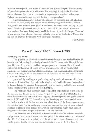 Proper 22 • Mark 10:2–12 • October 4, 2009 “Bending the Rules” The question of divorce is what first meets the eye as one reads this text. To be sure, the OT reading for this day, Genesis 2:18–25, attests to it. The epistle lesson, Hebrews 2:13, however, adds a new perspective to our text. There it clearly states that disobedience of God’s law has consequences, and no violator shall escape its just punishment (v.2). It also announces our salvation perfected through Christ’s suffering, as by his obedient death on the cross he paid the price for our sinful imperfection (v.10). Jesus had, by teaching and performing mighty works, demonstrated to those who crowed around him that in him the kingdom of God had indeed drawn closer to human beings. In our text, Jesus gradually left his ministry in Galilee and entered Judea, specifically the territory of Herod Antipas. The Pharisees have habitually been looking for opportunities to put Jesus to the test and trap him in his own words (peira,zontej, see also Mt 22:15). Neither the Pharisees nor the Herodians seem to grasp the actual purpose of Jesus’ mission on earth (8:31–32; 9:31:32). Instead, they see him simply as a threat to their own survival as teachers of the law and as those who influenced the Roman government for political gain. For any and every reason, they enlisted the help of their political enemies to create a front against Jesus, whom they assumed might have an unsettling influence on the people, contrary to their own interests. The Pharisees had in fact built a ‘fence around the law’ in order to establish and preserve their own manmade traditions (Mark 7:9). These stringent ‘tradition of the elders’ imposed strict regulations on the pious and religious, leaving many curious loopholes for the shrewd and meticulous interpreters of the law. Like the