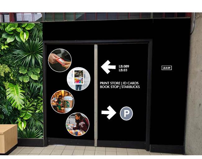 New directional signage will guide traffic to the Print Store, Bookstore, Starbucks, ID Card and parking! A large vinyl banner will also be installed in the Hall Building, on top of the escalators, between the scheduled Rogers ads.