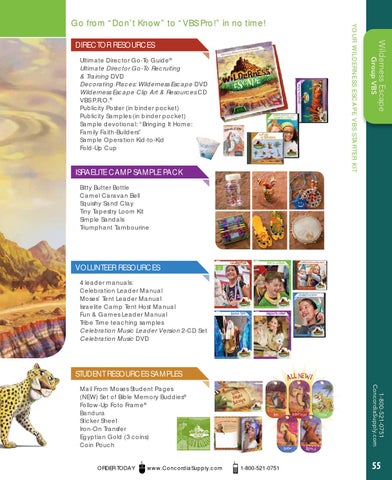 Ă Ultimate Director Go-To GuideÂŽ Ă Ultimate Director Go-To Recruiting & Training DVD Ă Decorating Places: Wilderness Escape DVD Ă Wilderness Escape Clip Art & Resources CD Ă VBS P.R.O.ÂŽ Ă Publicity Poster (in binder pocket) Ă Publicity Samples (in binder pocket) Ă Sample devotional: âBringing It Home: Family Faith-Buildersâ Ă Sample Operation Kid-to-Kid Fold-Up Cup