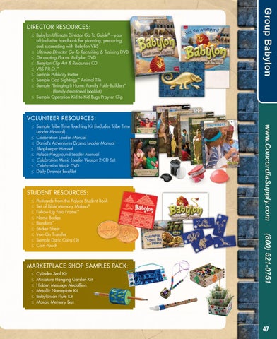 ≤ Babylon ultimate Director Go-to Guide®—your all-inclusive handbook for planning, preparing, and succeeding with Babylon VBs ≤ Ultimate Director Go-To Recruiting & Training DVD ≤ Decorating Places: Babylon DVD ≤ Babylon Clip Art & Resources cD ≤ VBs P.r.O.™ ≤ sample Publicity Poster ≤ sample God sightings™ Animal tile ≤ sample “Bringing itt Home: Family Faith-Builders” (family devotional booklet) ≤ sample Operation Kid-to-Kid Bugs Pray-er clip