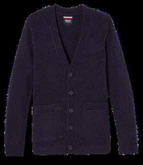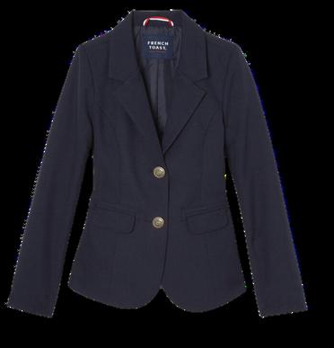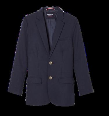 KhakiPants,Button-upShirt,NavyBlazer,NavyBlueTiefrom FrenchToastwithblacksocks,andblackshoes.
