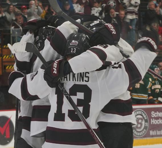 In the Clarkson University game, the men dominated in the 2nd and 3rd periods with two scores in each period. John Prokop ‘26 assisted Ville Immonen ‘24 for one goal, and Tyler Watkins ‘24, Brandon Buhr ‘26, Cullen Ferguson ‘25, and Carter Korpi ‘26 also made scores, with Liam Robertson ‘24 assisting on two of the scores. Goalie Kyle Chauvette ‘26 made 34 saves against Clarkson to keep his teammates’ scoring streak strong. Union endured through 6 penalties lasting 12 minutes total to take home the win for the team.