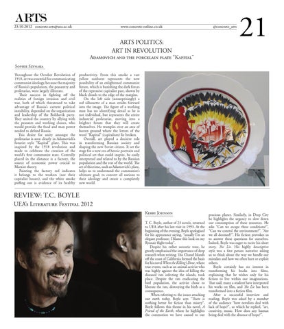 REVIEW: T.C. BOYLE UEA’s Literature Festival 2012 Kerry Johnson T. C. Boyle, author of 23 novels, returned to UEA after his last visit in 1993. At the beginning of the evening, Boyle apologised for his appearance saying, “usually I’m an elegant professor; I blame this look on my Ryanair flight today”. Despite his rather sarcastic tone, he greatly emphasised the importance of deep research when writing. The Chanel Islands off the coast of California formed the basis for his novel When the Killing’s Done, where true events, such as an animal activist who was highly against the idea of killing the diseased rats infecting the islands, took place. Despite the rats eradicating the bird population, the activist chose to liberate the rats, destroying the birds as a consequence. When referring to the issues attacking our earth today, Boyle says “There is nothing better for fiction than misery”. Boyle follows this theme in his novel, A Friend of the Earth, where he highlights the commotion we have caused to our