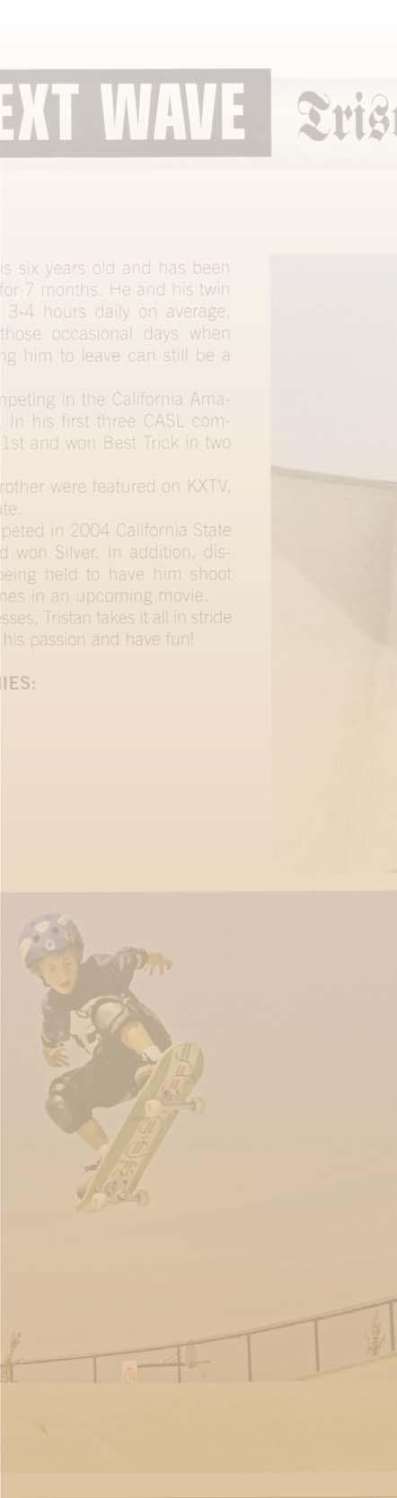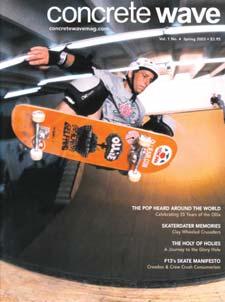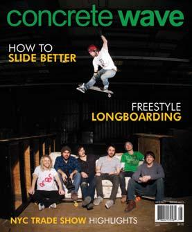 Subscriptions (5 issues) are US$26 FIRST CLASS or CAN$26 (US$44 outside North America). Address change? Mag not arriving? Email us... don’t go postal. We can sort it out. mbrooke@interlog.com. We will notify you when your subscription expires. Publisher’s permission is required before reproducing any part of this magazine. The views and opinions expressed in Concrete Wave are not necessarily those of the publisher. We happily accept articles and photos. Please contact the publisher directly at mbrooke@interlog.com before you submit anything. We are looking for a variety of stories and images as long as they are skate related.