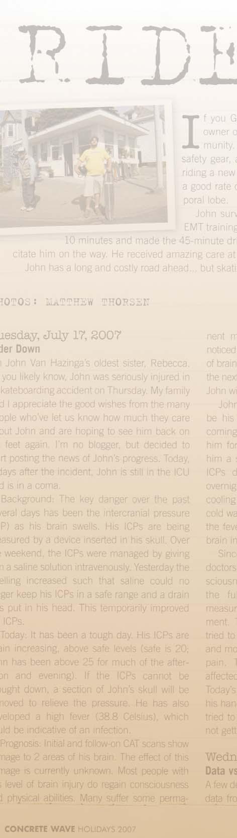 I got an issue of CW with my new board, and I was flipping through it and saw the Helmet Safety Awareness article. I had the same thing happen to me. My stepbrother died longboarding downhill with no helmet. I am glad CW continues to promote helmet use.