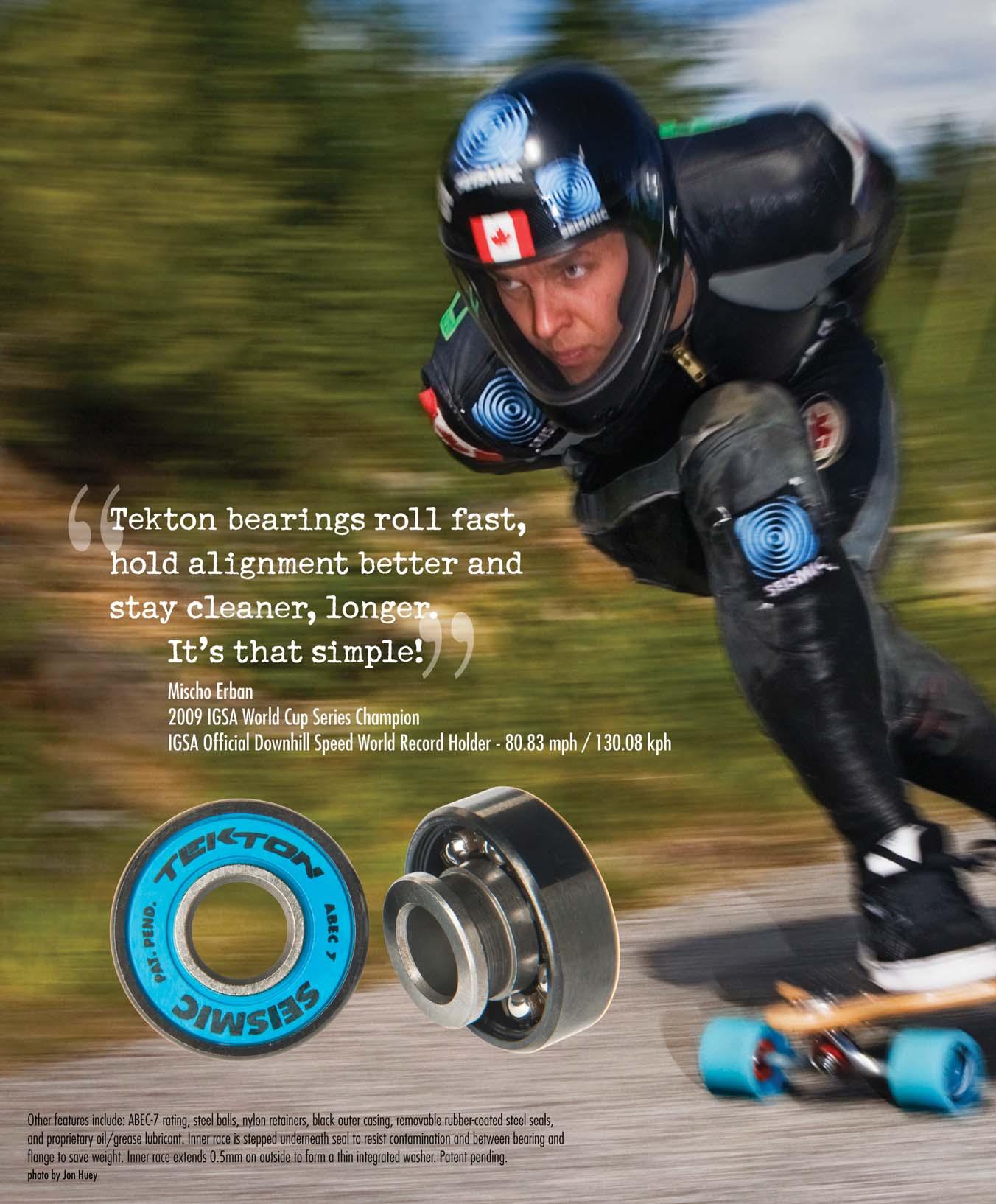 Seismic has released the patent-pending Tekton™ bearing – the bearing behind the Official IGSA Downhill Speed World Record. More than two years in development, Tektons feature wide, flat contact surfaces at the ends of integrated, custom-machined half-spacers. The broad flanges square up, co-align and self-stabilize inside your wheels – correcting for flaws in bearing seat levelness, bearing seat spacing, axle diameter and axle straightness. The Tektons literally block themselves from sitting or rocking out of alignment, so they stay straighter than any other bearing system ever. Your wheels roll faster with better control, while the bearings last longer and stay quieter. info@seismicskate.com