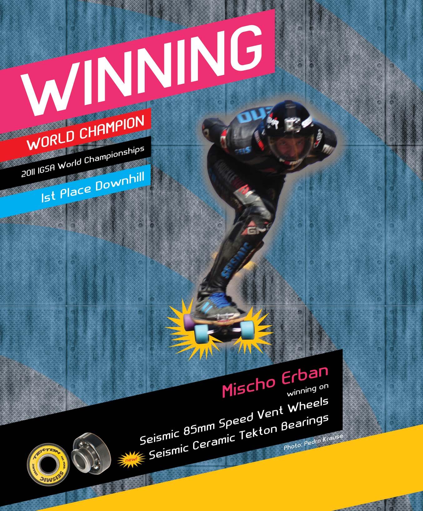 Erban rode a solid and perfect race as he picked off his rivals one by one. For Mischo, the win was especially sweet. After winning the World Cup Series in 2009, he had made wholesale equipment and sponsorship changes; he’d started his own deck and truck company and switched wheel sponsors. Since then, he had struggled to return to his dominant form. There had been flashes of brilliance, but Erban had gone winless in World Cup competition for the past two seasons. But by working tirelessly to dial in his equipment and reach peak conditioning, it finally all came together as he won the biggest race of his life.