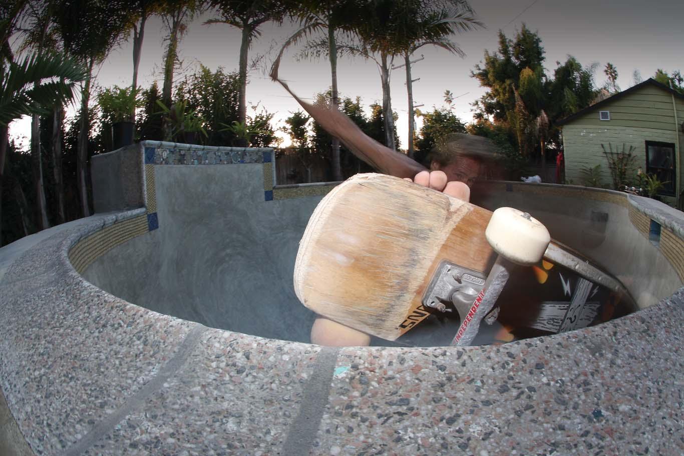 The skater in the above photo is “Barefoot” Mike Muehe. Mike has his own mini-pool in his backyard, and my sons and I got a chance to hang out with him last summer. He’s quite the ripper. But what makes him exceptional is his ability to shred his pool barefoot. This phenomenal photo captures Mike at what he does best. Talk about a soul man!