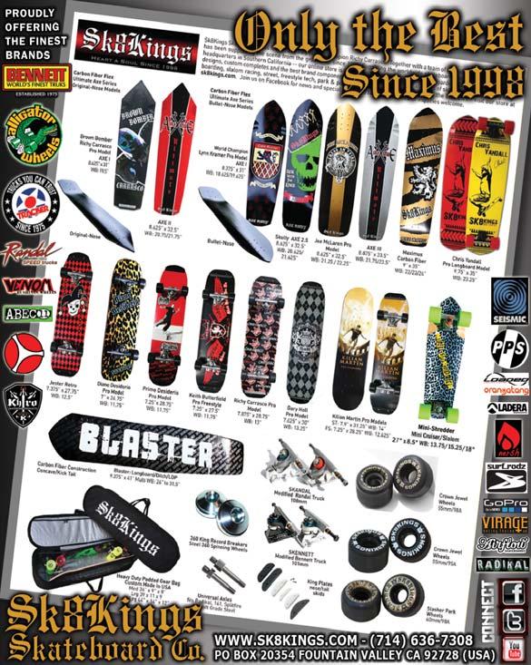 Sk8Kings Skateboards proudly releases World Champion Gary Holl’s signature pro model for 2012. Designed as the perfect cross-over street/freeestyle board and pressed in the legendary Sk8Kings mold, this 7.625” x 30” deck features symmetrical double kicks with a sharp looking Holl Crest Argyle graphic (skid plates optional). sk8kings.com
