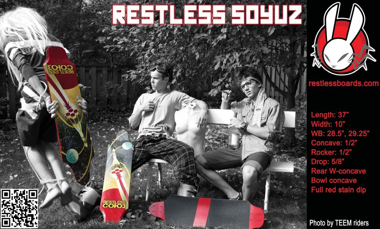 After a year of ideas and prototypes, the Soyuz board finally hits the market in 2012. Designed around an 8-ply construction, this free-ride oriented board features a slightly dropped platform, small W concave and a rocker. The W and the progressive drop provide extra stiffness to this light and aggressive board. The tub concave feels comfortable and locks your feet in critical areas. Like the Soviet rocket, the Soyuz is reliable and without compromise on performance. restlessboards.com