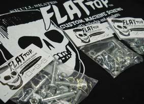 Skull Skates Flat Top mounting hardware are custom machine screws that feature a larger-diameter flat top, sometimes known as a pancake head. Unlike roundhead screws, which stick up above your deck surface, the Flat Top sits flush with the top of your board. And unlike countersink-head screws, which can create stress cracks and weaken your deck, Flat Top hardware actually reduces stress by spreading the force over a wider surface area. Each set includes flat washers to protect your topmount decks from getting chewed up by the nylocks. Available in 1”, 1.25” and 1.5” sizes. skullskates.com