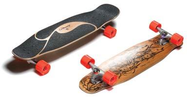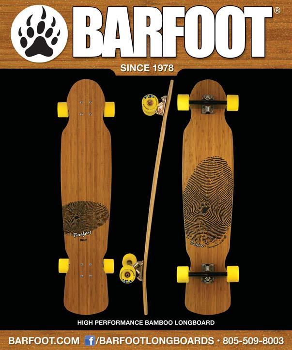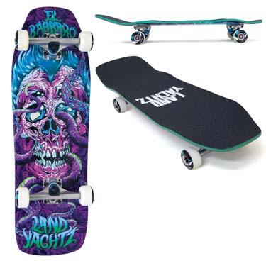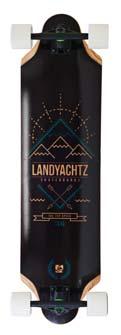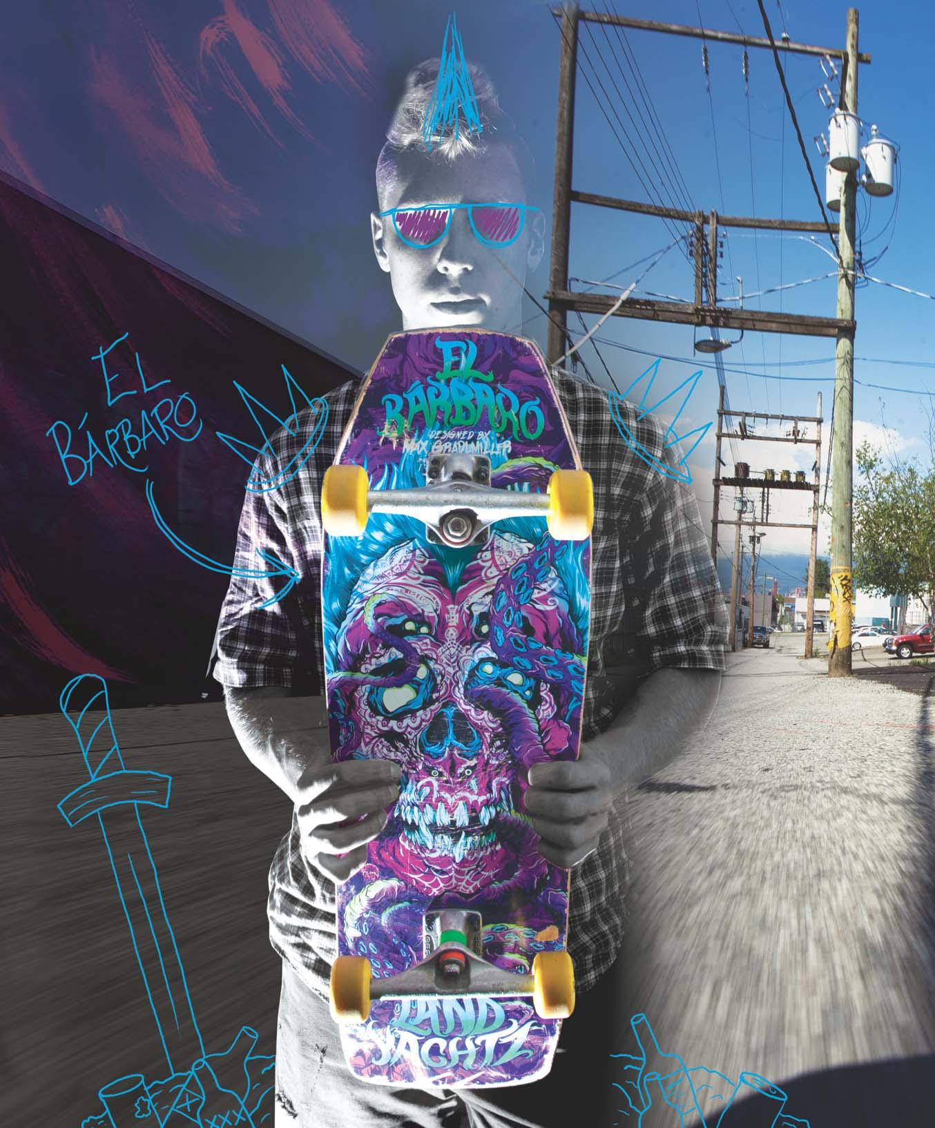 The El Barbaro is an old-schoolinspired pool shape has been designed by Max Gradmiller to be a great all-around destroyer of terrain. It is made up of seven plies of hard rock Canadian maple and is fully dipped in turquoise with a wicked graphic done up by Scarecrow Oven. It features mild molded wheel wells, a subtle nose and a boxy tail. It is 30” tip to tail and 9.25” rail to rail with a 14.12” wheelbase. Set it up with Polar Bear 155s and 57mm Street Hawgs and you’ll be set to conquer anything in your path. landyachtz.com