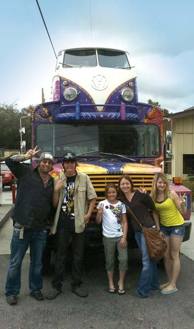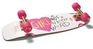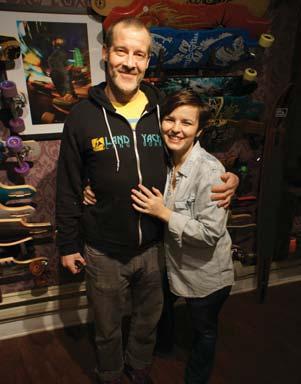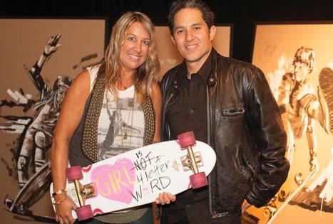 Cindy worked tirelessly with the folks at Dusters to create this unique “Girl is Not a 4 Letter Word” deck. Part of the proceeds will go to the Girls Riders Organization. Notice the Longboarding for Peace logo on the tail. This photo was taken at the Skateboarding Hall of Fame. Christian Hosoi was inducted. Photo: Ian Logan