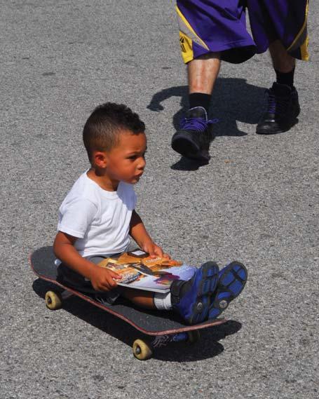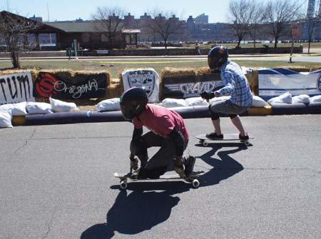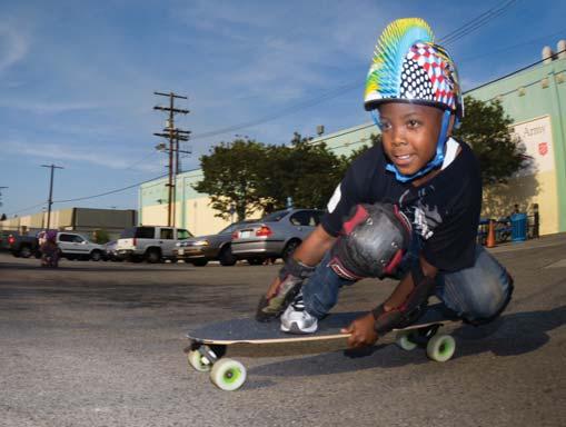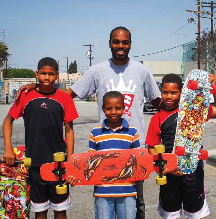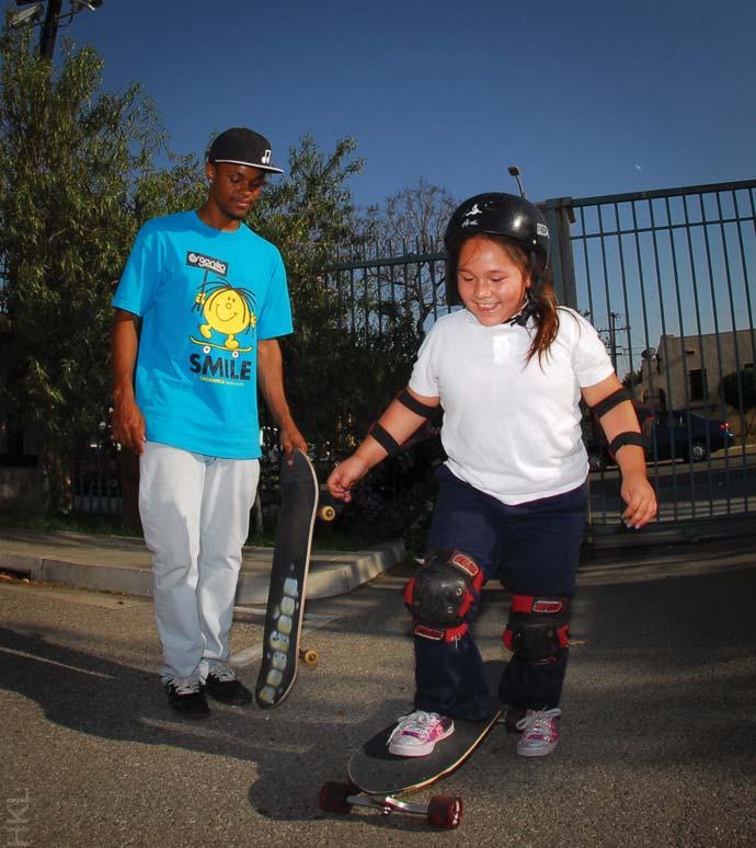 Iwent to the Watts after-school skateboard program to help out just before Christmas. I came prepared to put on a small contest and give away a few prizes. Turns out the kids really could not skateboard. They didn’t know any tricks and were frustrated trying to learn them, so I suggested a “race.” They were very excited, so that’s what we did. Our first problem was they raced right into the fence — not a good way to stop. So I set up a cone and they were to “race” around it.
