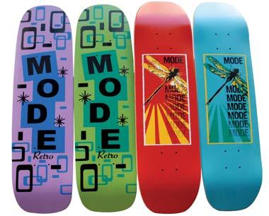 MODE Skateboards embraces the diversity of skateboarding with decks and products designed for all types of skating. All boards are made in the U.S. and screen printed by team rider/freestyler Terry Synnott. With its own in-house screen printing operation, MODE strives to keep its graphics fresh, unique and always changing. modeskateboards.com