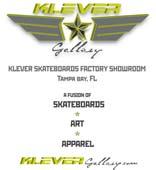 The Klever Skateboards showroom will soon be open to the public and to dealers. The “Klever Gallery” will be a retail location showcasing art by local artists, Klever’s current line of boards, custom “one-off” boards and clothing. They will also have some of the top selling skateboard and longboard brands and a fully stocked skate shop. klevergallery.com