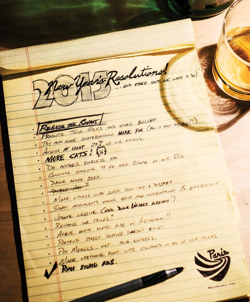 This issue also features two pieces on travel. As longboarding has exploded in popularity around the world, it has opened up opportunities for skaters to explore new terrain, and to forge new friendships. No matter where you ride, or the types of terrain you skate, we wish you the very best for 2015.