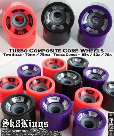 Sk8Kings completes the initial roll out of their Turbo Wheel Series featuring two sizes, three duros and two core versions. First on the scene in 2013, the aluminum core version has taken the Sk8Kings team riders to the top podium spot in many races. The new composite core version brings the same precision characteristics of the CNC core wheel to the market at a competitive price. Both core versions offer their Turbo technology. Their high grade urethane formula offers riders resilience, traction and predictable slide control. Available in 70mm or 75mm with duro choices of 79, 82 and 85A.. Sk8Kings.com