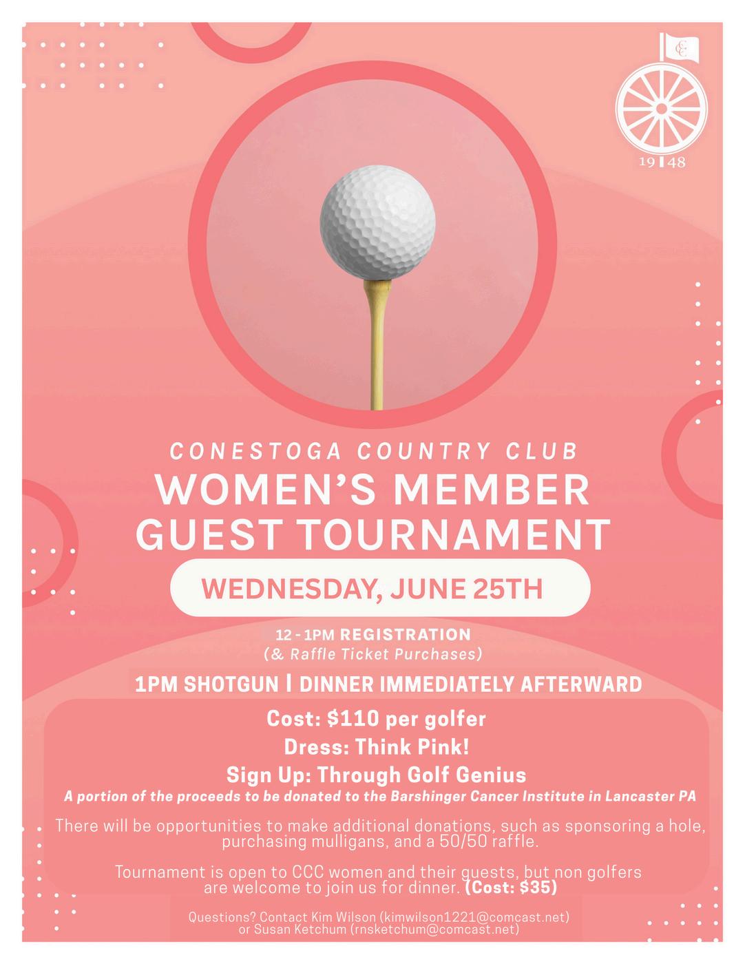 LadiesMemberGuestTournamentistobeheldWednesday,June25.Proceeds fromtheeventtobenefittheAnnBBarshingerCancerInstitute.1PMShotgun start,dinnertofollow.SignupthroughtheConestogawebsiteandGolfGenius. InviteaguestoranotherCCCmembertoplay.$110perpersonincludes18holes, cart,dinnerandacontributiontothefundraiser.Ifyoucan’tjoinusforgolf,join usjustfordinner($35perperson).A50/50RaffleandMulliganswillbesoldthat day-alltobenefitthefundraiser.Comejointhefunandhelpusfightcancer!!! IfyouhavequestionspleasereachouttoSusanKetchumorKimWilson.