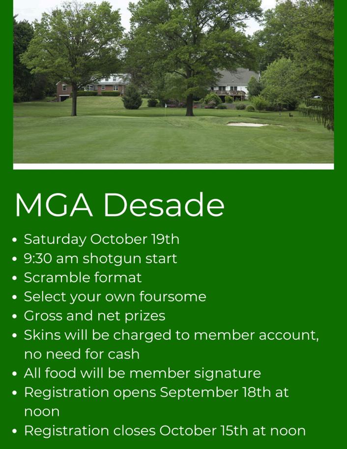 • The MGA-WGA DeSade Tournament is scheduled for Saturday, October 18th with a 9:30 Shotgun Start.