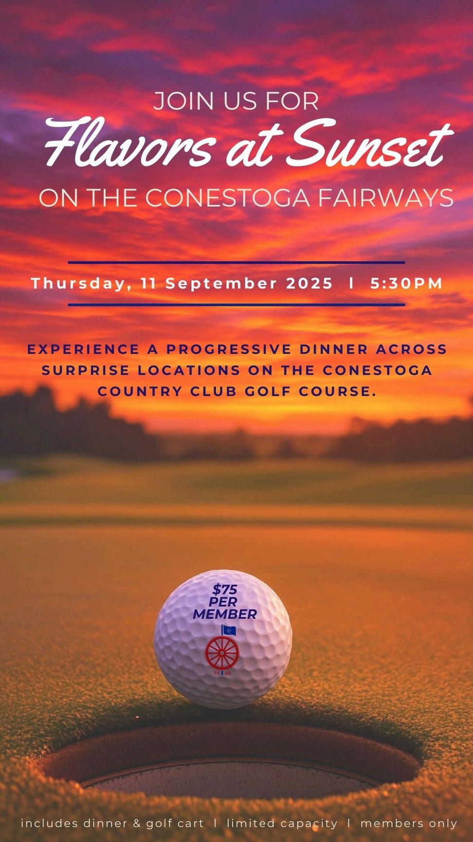 Flavors at Sunset – Thursday, September 11 - A progressive dining event across the golf course. An evening of great food, drink, and camaraderie with one of the best views in Lancaster. Currently sold out!