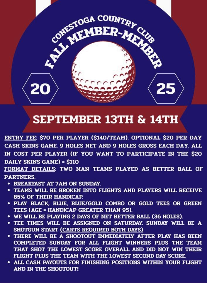 As we celebrate the change of seasons, it’s worth reflecting on what makes Conestoga so special, families, friendships, and traditions that span generations. This summer we’ve had the joy of watching our juniors shine: from the swim team setting personal bests and achieving team success, to our Junior Golfers capturing the Inter-Club Championship. These accomplishments remind us that a country club is about much more than golf, dining, or events, it’s about community and the pride we share in each other’s success.