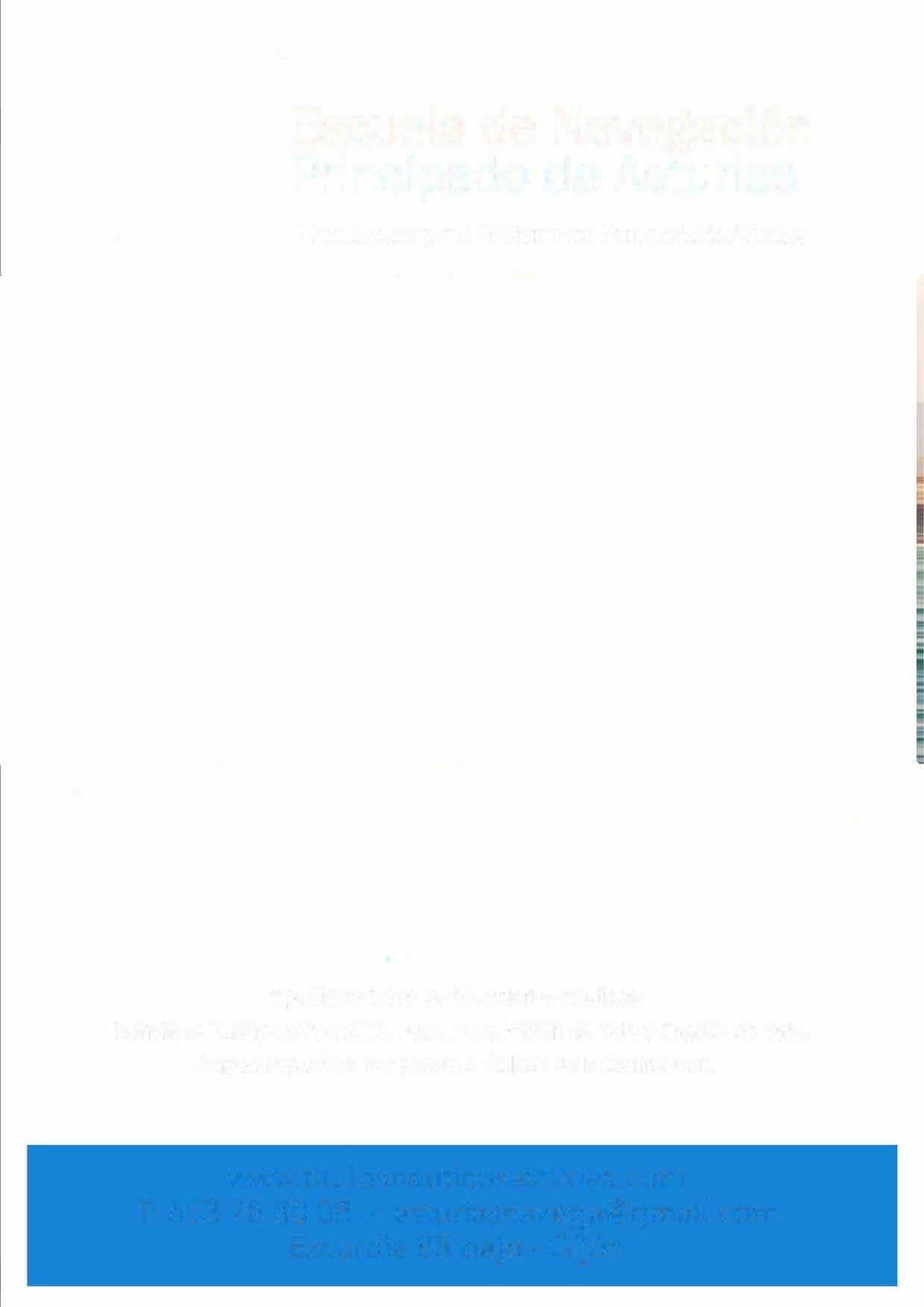 Escuela de Navegación Principado de Asturias Homologada porel Gobierno del Principado deAsturias Impartimos todas las titulaciones náuticas: Licenciade Navegación-Titulín, PNB, PER, PatróndeYate y Capitán deYate. Cursosimpartidos por personaltitulado de la Marina Civil. www.tituIosnauticosasturias.cam T: 653 78 80 08 - asturiasnavega@gmail.com Ezcurdia 85 bajo - Gijón