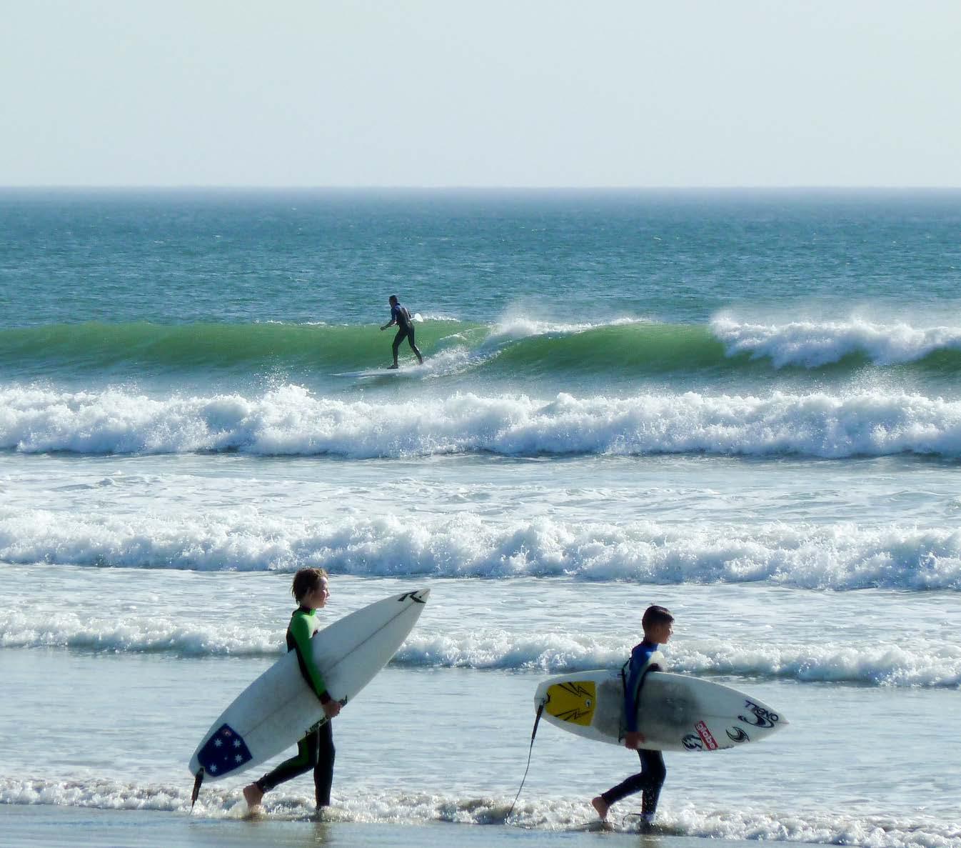 del suroeste combinado con vientos offshores del este, se pueden encontrar ondas huecas, especialmente cerca del punto y los arrecifes ubicados en la cabeza de la bahía. Sin embargo, lo más común son las derechas e izquierdas que surgen en bancos de arena, algunas veces cerrando completamente. Aunque la salida al agua puede ser un poco complicada, la mayor parte de la bahía es accesible para principiantes, lo que ha llevado a un auge en las escuelas de surf en la zona. La fiabilidad del surf en Las condiciones perfectas