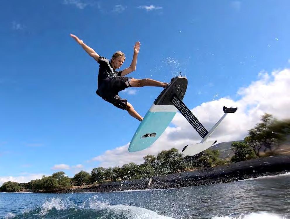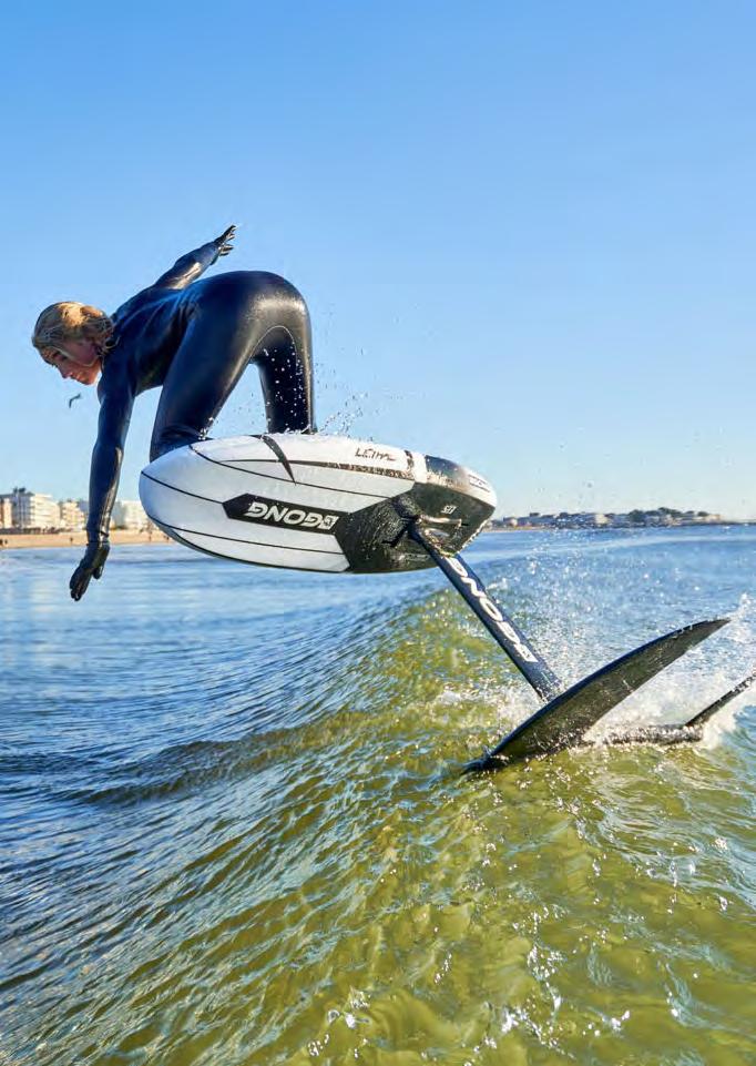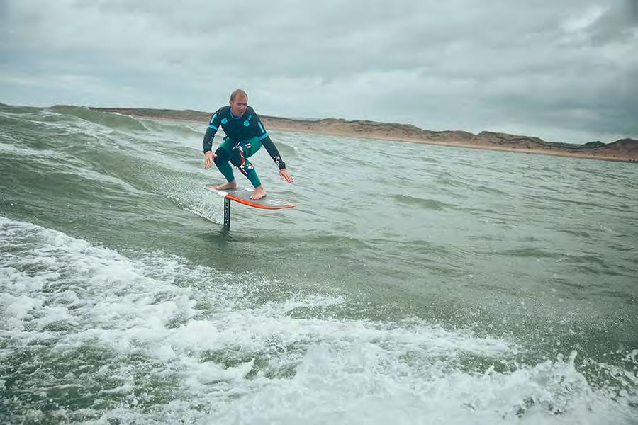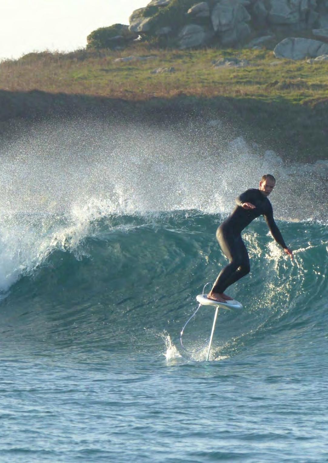 arriba creando más apoyo. Por el contrario, con la dirección opuesta, cuanto más peso se aplique sobre el pie que va adelante, más se sumergirá el ala bajo el agua. Los surfistas de foil literalmente se deslizan sobre la superficie y pueden realizar giros más cerrados que en una tabla de surf clásica.