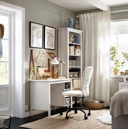 Puedes montar una mesa de estudio en una zona de paso. La solución en este caso es colocar un tablero suspendido (pero bien asegurado a la pared) y una o dos baldas para carpetas y útiles de trabajo. El tablero no debería ser menor de 80 cm de ancho para apoyar los antebrazos.