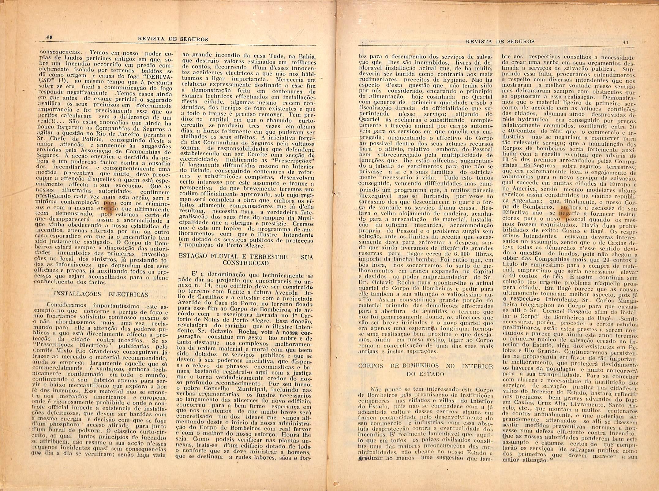 I'ara qiieni vive indifferenle a tudo quanio se relacioiia com as inais vulgnres e normaes providencias geralmenle adoplada.s conIra fogo, porlera affigurar-sc qiie vemos Irido por um prisina que avoUiina poderosamciile o perigo dc- incendio e .suas consequencias, tcvando-nos a sugge.stues importunas c talvez dispcn.savci.s. Assim scria, de facto, sc o ilcsenvolvimcnlo das nossas indiistrias vulto qiie a.ssnniiii o iiosso comniercio de inflnmmaveis, o grande inci'cmento qne vac lencio o antoinobilismo em nosso meio, a existencia de- centroa de divcr.soes ondc sc reunem para eima de 2.(>00 pc.ssoas e tanfos outros risoo", de grande viiito e perigo nao ehamasseni a atten?ao d'aquelles que devem realmcnle Inlerc.ssar-sc pela vidn e haveres da popiila<;ac), ffilo deve nem pddr o risen de fogo continuar como am factor sem imporfnncin na.s coustrucedcs, tios servifos publlcos c particulares de agua, na.s installafocs elcctricas e em tnntn.s oiitra.s dbs modalidaries tao complexas cm que incldem os Servians preventives de iiiiciativa piiblica e )>articidar, normaes em toda.s as cidades que luio dormem exciusivamente a sombra da protecffio dos bombeiros c sob a gnrantia da apoliee de seguro. A(iiii