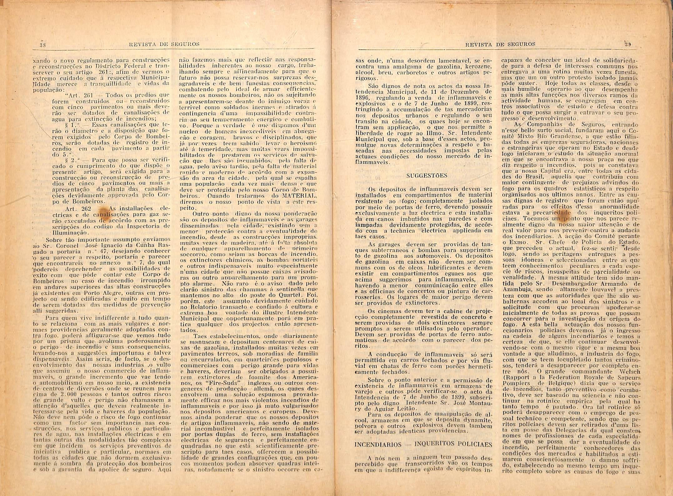 As Companhias de Segiiros, cntrando iiVsse hello surlo social, fundaram aqiii o Comile Mixto Rio Grandcnse, a que estao filiailas lodas as emprczas seguradoras, nacionaes c eslrangeiras que operam no Cstudo e dcsdc logo iniciaram o cstudo da situacao anormal em (jue se encontrava ii nossa priRna no que diz respeito a incendios. pois se eonslatavii que a nossa Capital era, cntrc toiias as cldadcs do Brasil, aqiielia que contribuia com maior contingente dc prejuizos .advlndos do fogo para os qu.adros estatisticos a respeito organisados nos uUimos anno.s. Eutrc as causas dignas tie registro que foram cntao apuradas para os effeitos d'e.ssn anormalidade estava a precarie^jjfc dos inqueritos poli- t'lacs. Tocamos urij^nlo que nos purece rcalmente digno da nossa maior attenfao e tie real valor para nos prevenir contra a audacia tics incendiario.s. .A acciio do Coiniti perante o Exino. Sr. Chefc dc T'olicia do Eslado. tiue precedeu o actual, fcz-.se .scntir ""ite-Sdc logo, scndo as pcritagens eiitrcgucs a pcssoa.s idoneas e seleccionadus entre as que teem conhefiinenlos peciiliaros a cada e.specie de riscos, insuspeitas de parcialitlade ou venalidadc. A mesma attitude tein side inantida pelo Sr. Dcscinbargador Armando tic Azambuja, scndo altamente louvavel a prestcza com que as auloridades tjuc Ihe sao subalternas accodem ao local dos sini.stros c a solicitude com que jirocurani apoderar-sc inicialmente dc lotlas as provas que possum concorrer pafa a invcstigacao da origem do fogo. A csta bella actuavao dos nossos funccionarios policiacs devcmos ja o ingrcs.so na cadeia de alguns inccndiarios c tcmos a ccricza tie que. sc ella continuar dcsenvolvendo-se com o iiicsnio rigor e a mesma boa vontade a que alludimo;"., a industrl.a do fogo, com que se teem locnplctado tanto.s criminoso.s, tenclera a desapparccer por completo, enIre n6s. 0 grantic commandanle Welsch (Rapport a In Federation Boyalc dc Sapuurs Pompiers de Relgiqiic) diziu que o si;rvi(,'o tie incendios, tanlo prcvcntivo-wuiio cimihativo, deve ser basoado nii sciencia e nao con tinuar na rotinice empiriua pela qual ha tanlo tempo 6 paulado. Ora tal rntinicc so podeni clesnppareccr com u crnprego de pcssoal lechnico e coinpelenle, sendo quo os peritos policiacs dcvcin ser relirados d'uniu lista em pos.sc das Oelcgacin.s da qual coiistcm. nomes de proflssionacs de cada especinlidade em que se possa dnr a evenfualidade do incendio, perfeitamente conhecetlores das eondigocs dos mercados e habilifado.s a cslimarem coiiscienciosanienle o damno soffrid_o, estabelecendo ao mcsmo tempo um inqucrito completo sobre as cau.sas do fogo e suas