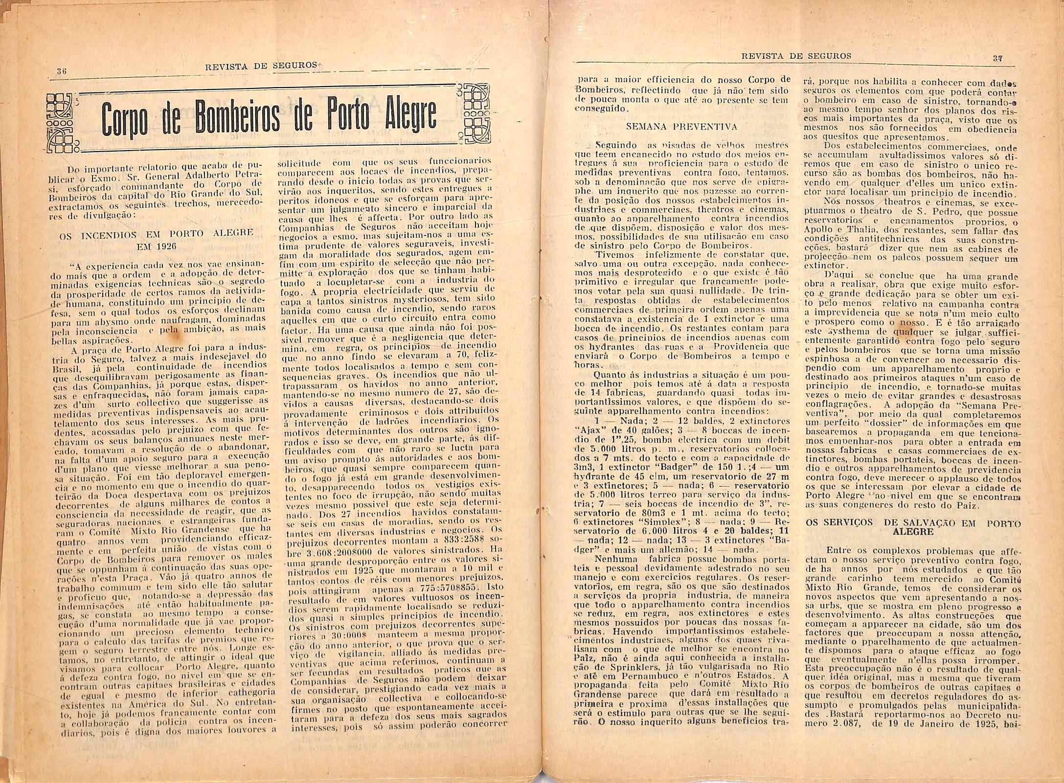 D'aqiii sc conclue que ha uma grande obra a realis.ar, obra que exige muRo esfor<;o .f grande dedicairar) para se obter um cxito pelo nienos relalivo na campanha contra a iniprcvidencia que .se nota n'um meio c.ullo e prospero conio o nosso. E e tao arrnigado cste xyslhenia de qunlquer se julgar .sufficientemenfe garantidd contra fogo pclo .seguro e pelos bomboiros que sc torna uma niissuo c.spinhosii a de coiivcncer ao necessario dispendio com um apparclhaniento proprio e (le.stinado aos primeiros ataques u'uin caso de lirinciilio de ineendio, c tornado-so miiitns vezes o meio de cvitar grandes c desastrosas eoiiflagrafoes. A adopcao da "Scmana Prevcntiva", por meio da qua) coniplelaremos uni pcrfeito "dossier" de infonnacoe.s em qiie bascarcmos a profiaganda em que tencionamos emuenhar-nos para obter a entrada eni nossas fabricas e casas coinmcrciaes de cxtinctore.s, bombas portatcis, bocca.s dc ineen dio c outros apparelhamentos dc previdencia contra fogo, deve merecer o applause dc todos OS quo sc intcressam por clevar a cidadc dc Porto Alegre "ao nivel eni que se encontrwn as siuis congeneres do rcsto do Paiz.