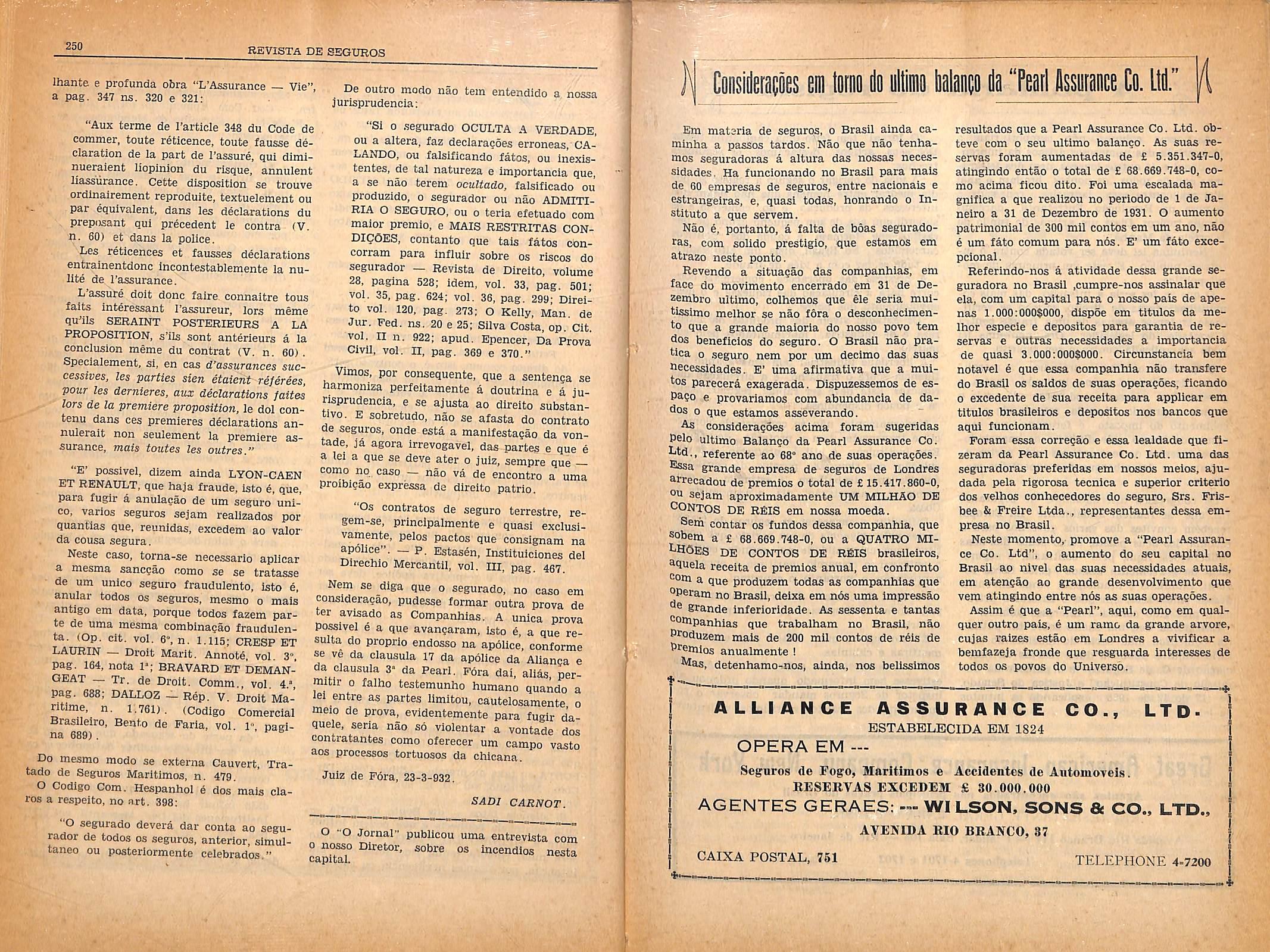 Nem precede a invocagao, sob que se procura abrigar, de rudeza intelectual, porque dos autos se colhe, com certeza absoluta, ser hode muitos e altos negocios, o que faz presumlr estar aparelhado para assumir obrigaQoes e Ihes atingir o alcance. Ora ,alem de Que 0 simples seguro novo tenha tido a virtude de libertar a re Alianga da Baia, de qualQuer lago contratual (clausula 17' da respectiapolice), o que dos autos se apura e que ^lem. ela, nem a co-r6 Assurances Generales i^eceberam o menor aviso da nova operagao. Intenta o A, fazer crer que disso se incumu Adalbert© Trindade. Mas Adalbert© nao Agente nem preposto das RR., e, assim, Qualquer promessa sua nao podia gozar o conuo de vincula-las. Ao demais, o aviso deveria evestir forma graflca, e desde que o A. ha]a Int^ ° esse encargo a pessoa alhela e des- eressada nos negocios das RR., culpa alcla"^ cabe da inexecucao da incumbenSe do inadimplemento da promessa do graco°T resultou prejuizo ao A,, jj . e nao contra estas, se devera ele ^Kir para lograr o ressarcimento. Entretan■ 0 exame dos autos nos convence de que to se incumbiu Trindade do encarAe e depondo quando ja nao era Qa Pearl, nega, pes juntos, houvesse upe*^^ ^®eebido tal comissao, e acrescenta que, ju certa vez, o A. pretendeu mostrarj, updlices relativas a outros predios segutra°^' Quais desejava, find© o contrato, ^ _para a Companhla que ele reprepfi tendo Adalberto aceito o convite ^ um motive acidental.