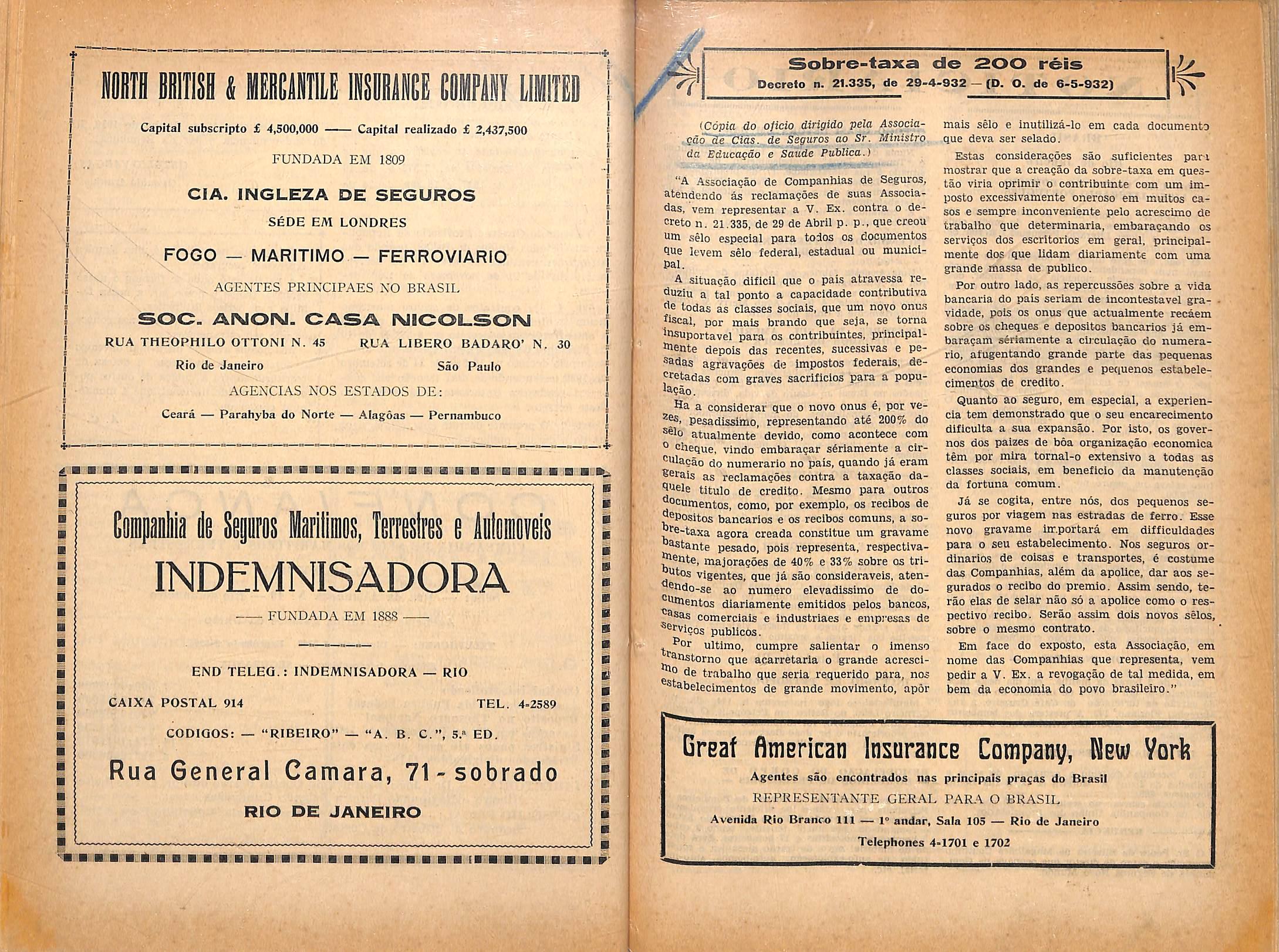 Ac minfstro do Interior e Justipa foi enderegada uma representagao tendente a chamar a atengao do governo para a situagao de desamparo em que se veem as empresas seguradoras. Existe urgente necessidade de alguma coisa £azer-se com o fim de remover certas anomalias no que refere aos seguros terrestres, as quais tornam quasi impossivel a sua vida e o seu desenvolvimento no Brasll.