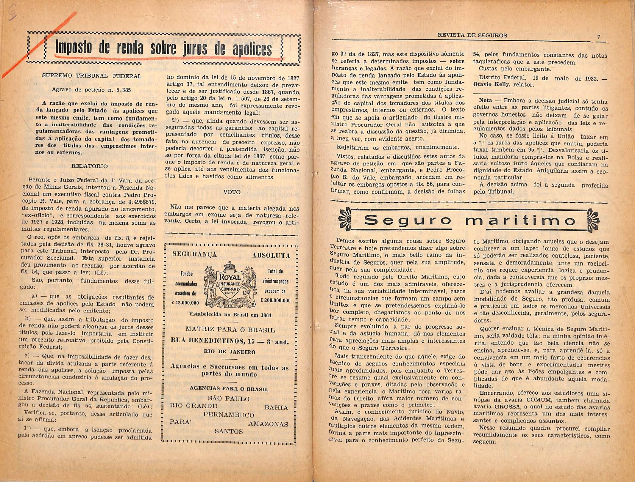 O regulamento de seguro proibe que se faga seguro, fdra do pais, de bens nele existentes, mas so o tem permitido, quando as companhias aqui domicilidadas nao o queiram aceitar. Logo, se o Ministro nao permits que as companhias sob a sua fiscalizacao segurem contra os riscos que possam ocorrer, durante a revolucao e movimentos militares, nao pode proibir que alguem o contrate no exterior, Seria uma incoerencia.