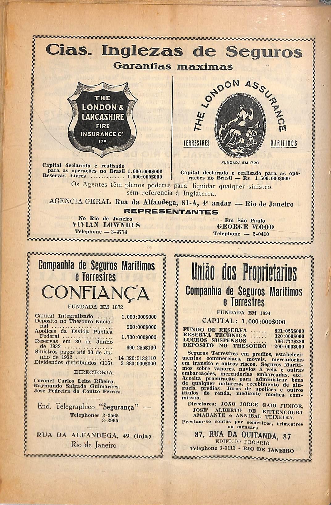 Seguros Terrestres em prcdios, cstabelecltnentos commerciaes, movcis, mcrcadorias em translto e outros riscos. Seguros Mariti mos sobre vapores, navios a vela e outras embarcagocs, mcrcadorias embareadas, etc. Acceita procuragao para adminLstrar bens de qualquer natureza, rccebimento de alugucjs, predios. Juros de apollces e outros titulos de renda, mediante modica commissao.