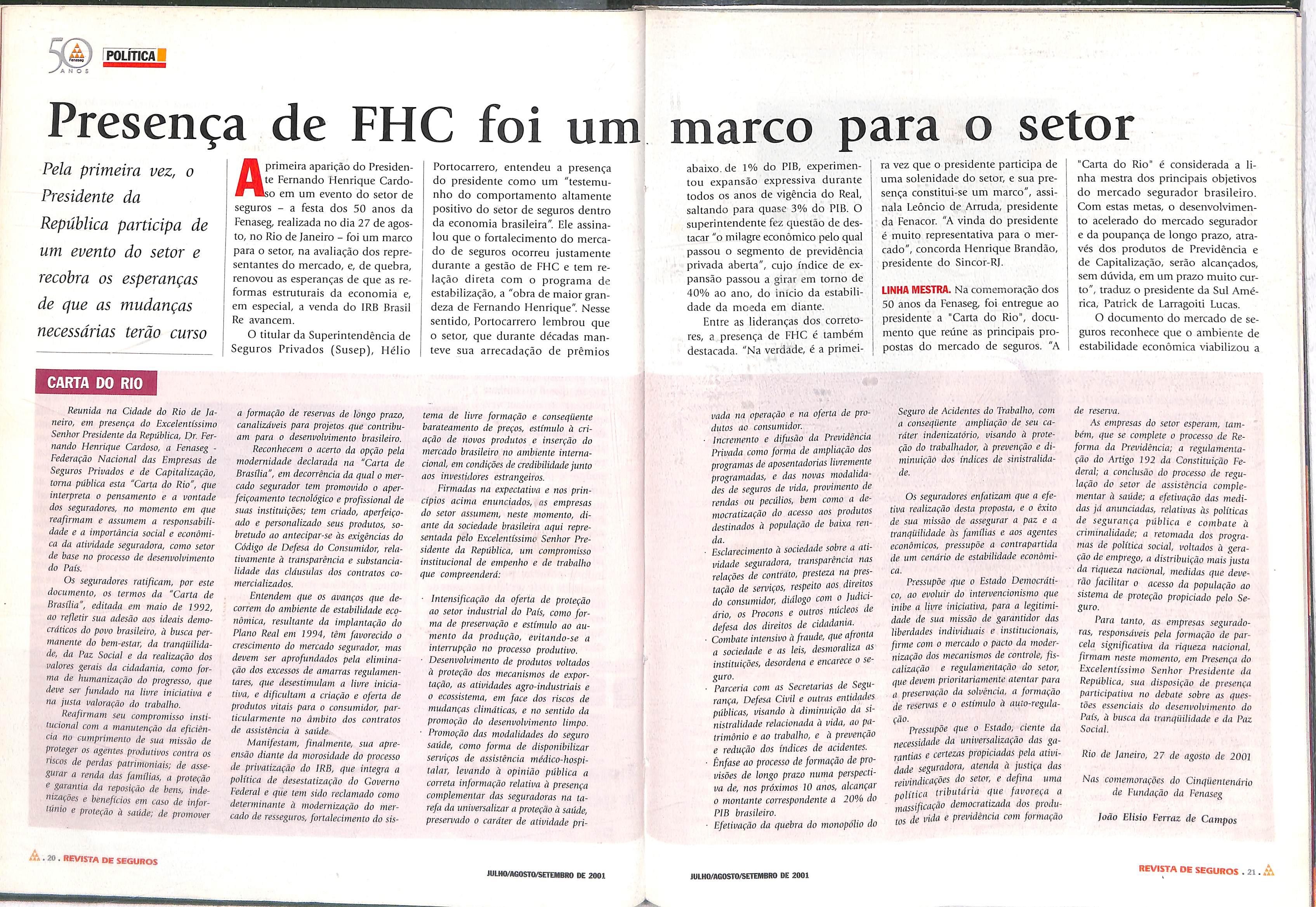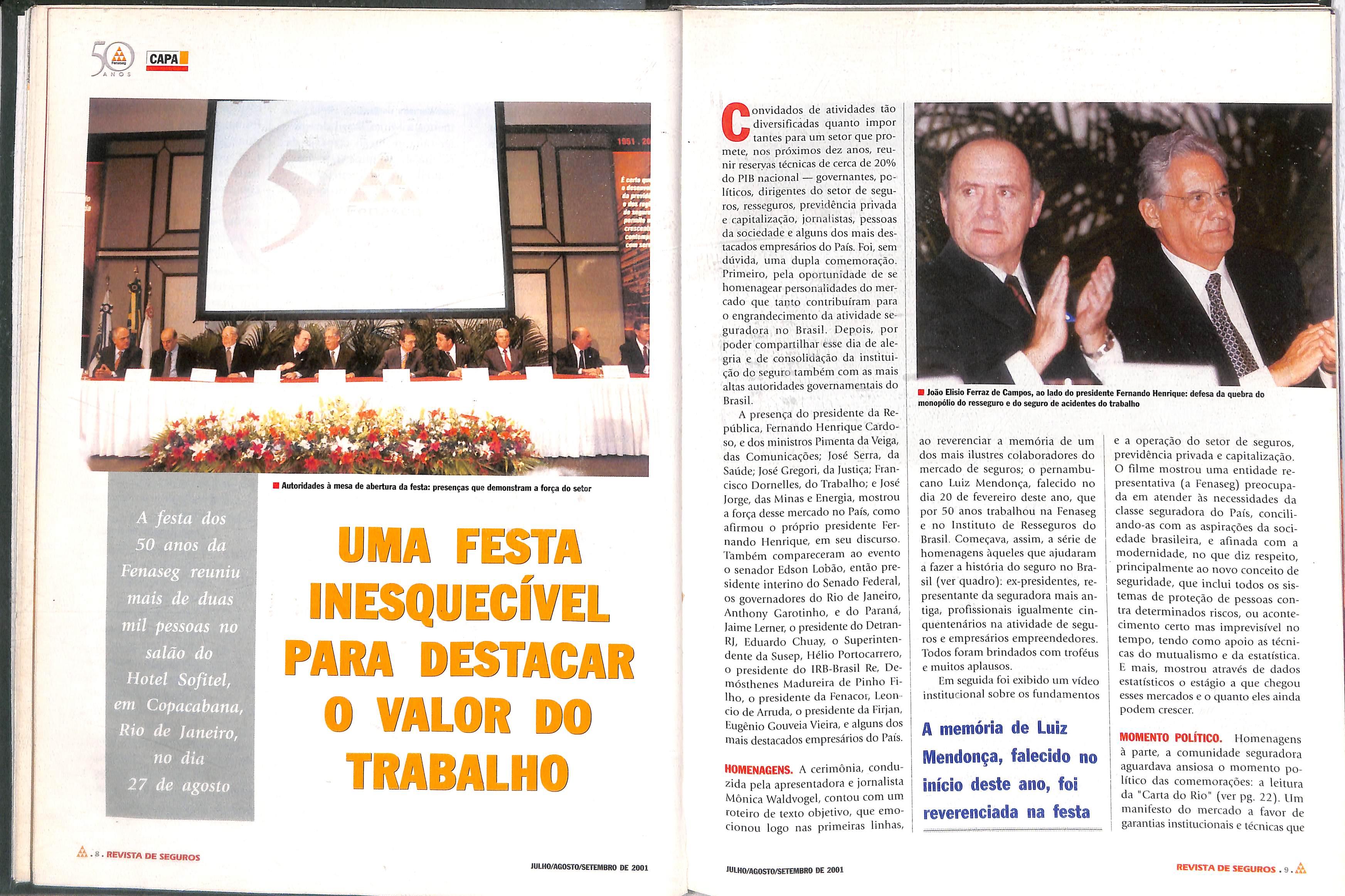 A presençado Presidenteda Repú blica, de cinco ministros de Es tado e de algumas das mais altas au toridades do País à solenidade de co memoração do cinqüentenário da Fenaseg, realizada no Sofitel Rio Palace, é mais que uma demonstra ção de prestígio político da classe se guradora. Pode-se dizer que é a ma nifestação pública de que o Govemo encontra-se disposto a um diálogo cuja importância, para o mercado, ficou evidenciada na expeaativa com que as mais de duas mil pessoas pre sentes na ocasião aguardaram,e entusiasticamente aplaudiram, não só a declaração de princípios e propos tas constantes da "Carta do Rio", mas sobretudo sua repercussão no discur so do Presidente Fernando Henrique Cardoso.