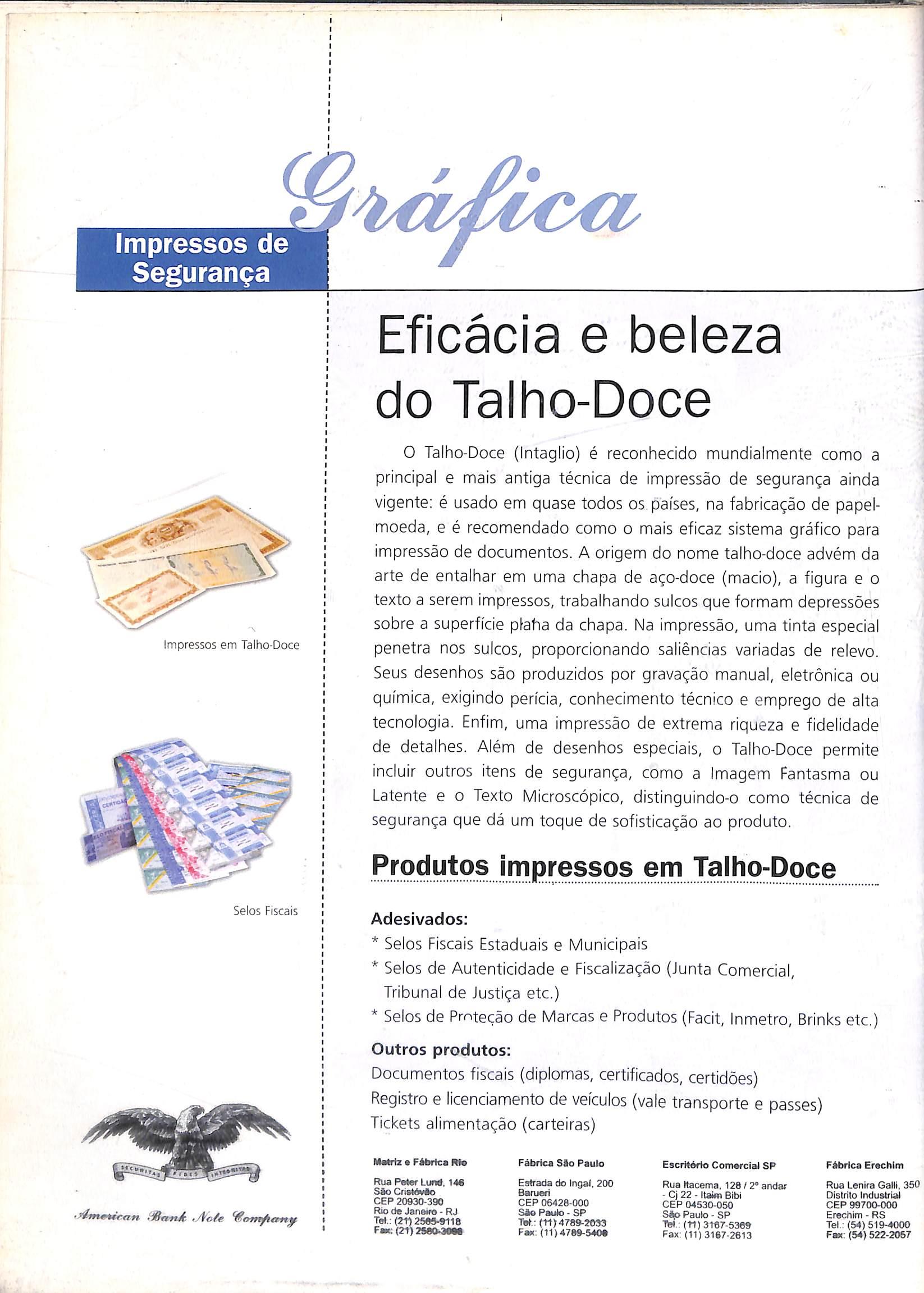 O Talho-Doce (Intaglio) é reconhecido mundialmente como a principal e mais antiga técnica de impressão de segurança ainda vigente: é usado em quase todos os países, na fabricação de papelmoeda, e é recomendado como o mais eficaz sistema gráfico para impressão de documentos. A origem do nome talho-doce advém da arte de entalhar em uma chapa de aço-doce (macio), a figura e o texto a serem impressos, trabalhando sulcos que formam depressões sobre a superfície píatia da chapa. Na impressão, uma tinta especial penetra nos sulcos, proporcionando saliências variadas de relevo. Seus desenhos são produzidos por gravação manual, eletrônica ou química, exigindo perícia, conhecimento técnico e emprego de alta tecnologia. Enfim, uma impressão de extrema riqueza e fidelidade de detalhes. Além de desenhos especiais, o Talho-Doce permite incluir outros itens de segurança, como a Imagem Fantasma ou Latente e o Texto Microscópico, distinguindo-o como técnica de segurança que dá um toque de sofisticação ao produto.