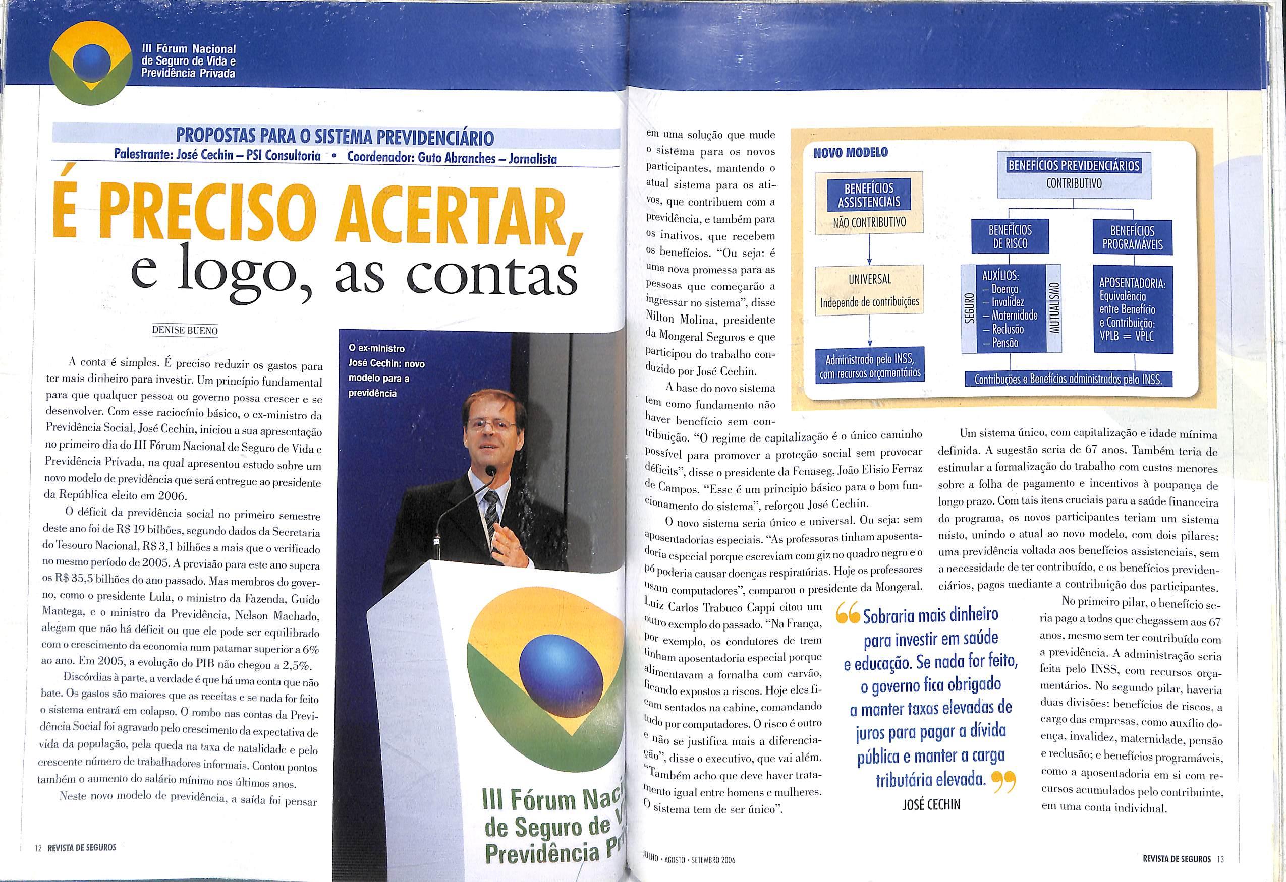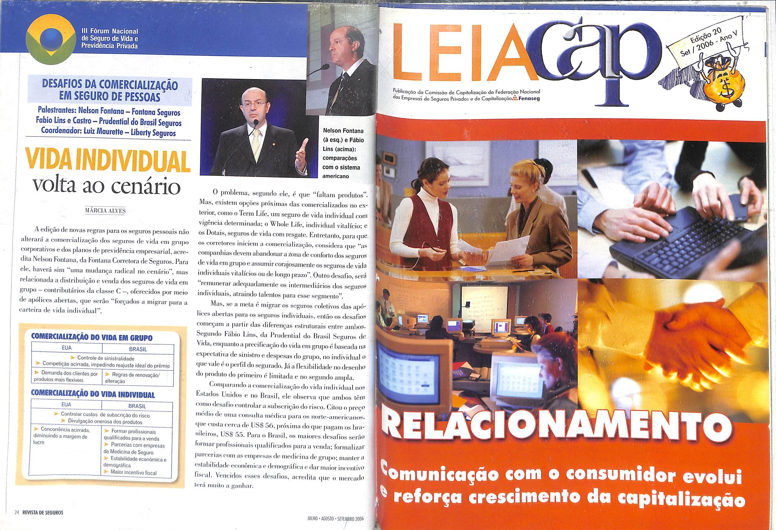 primeiro, de grande relevancla tambem para toda a economia brasileira e que contou com a presenga do ex-Minlstro da Previdencia Social Jose Cechim,reuniu especialistas e dirigenles de empresas para deba ter uma agenda de trabaliio focada num tema comum: a atualidade e o I'uturo dos regimes de capitalizagao. Foram ao todo40 palestras em loi no da melhor forma de se promover a prolegao socjal da populagao, sem magica e sem ilusionismo.