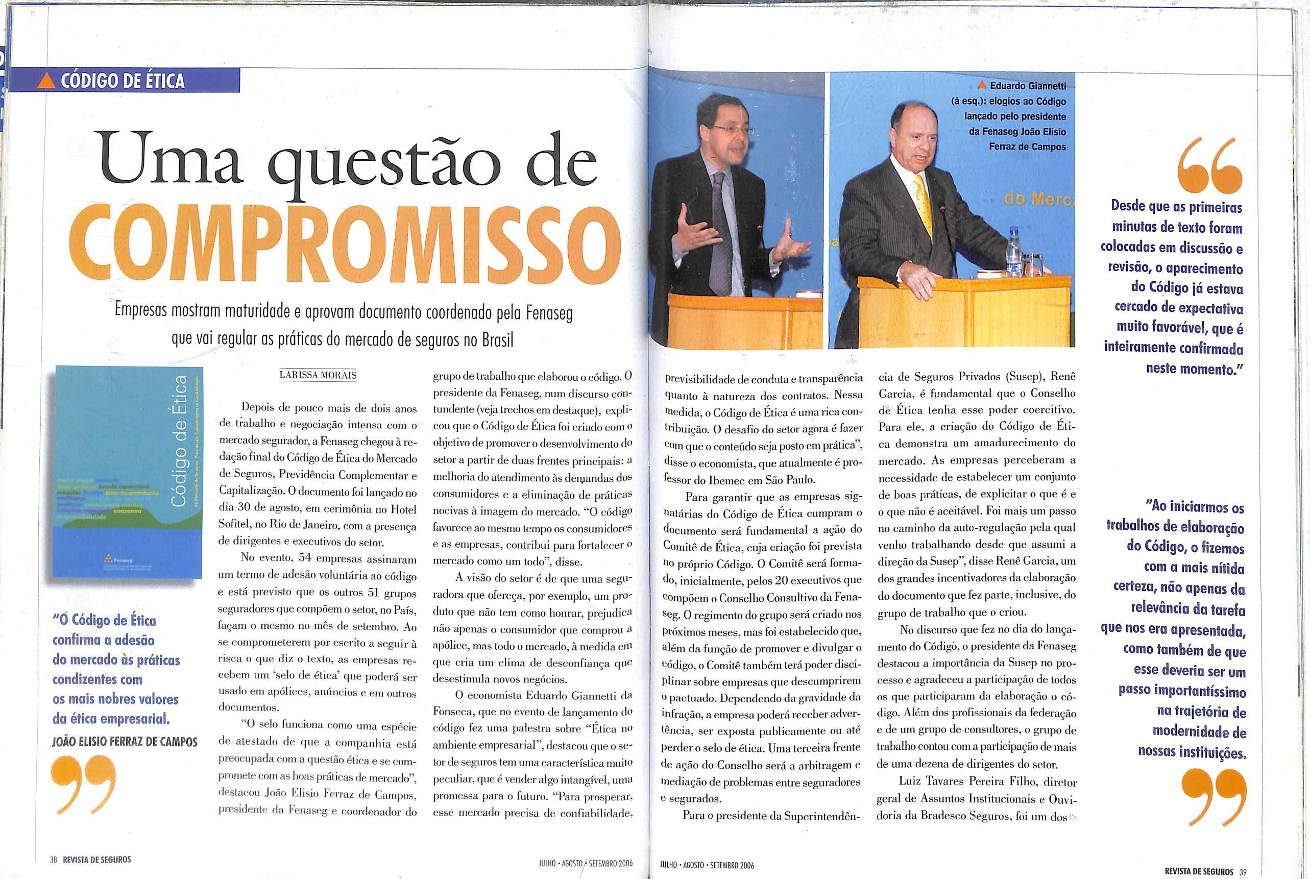 As empresas que aderireni ganham o selo de etica. Joao Elisio Ferraz de Campos, presidente da Fenaseg, coordenou o grupo de Irabalho que elaborou o Codigo