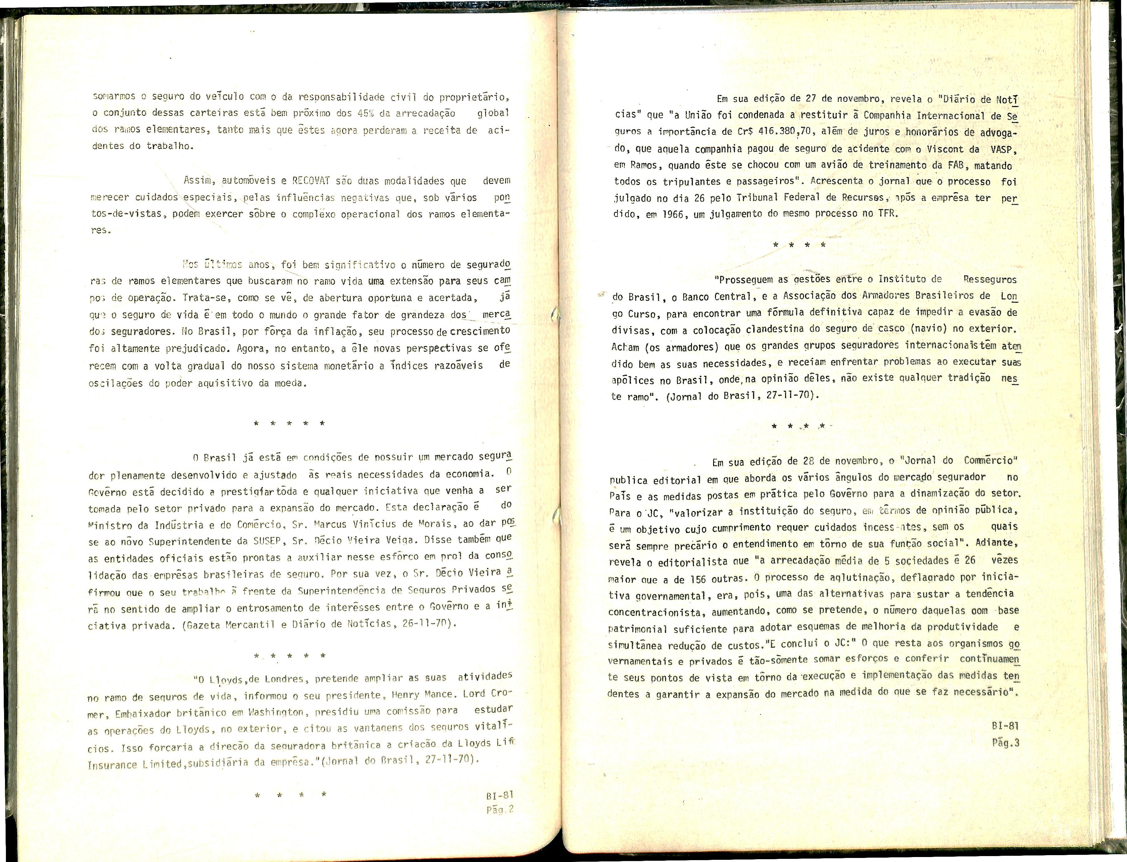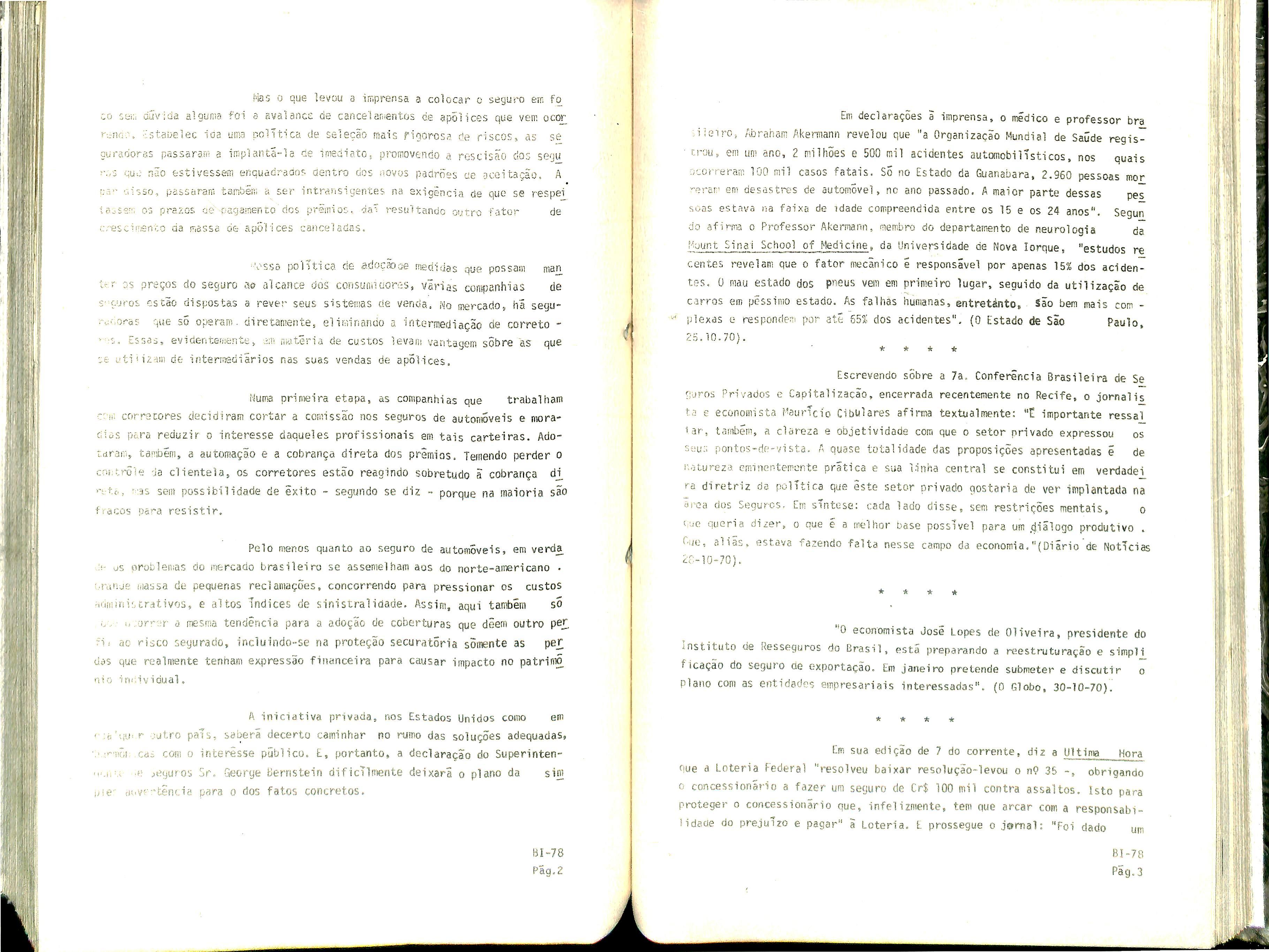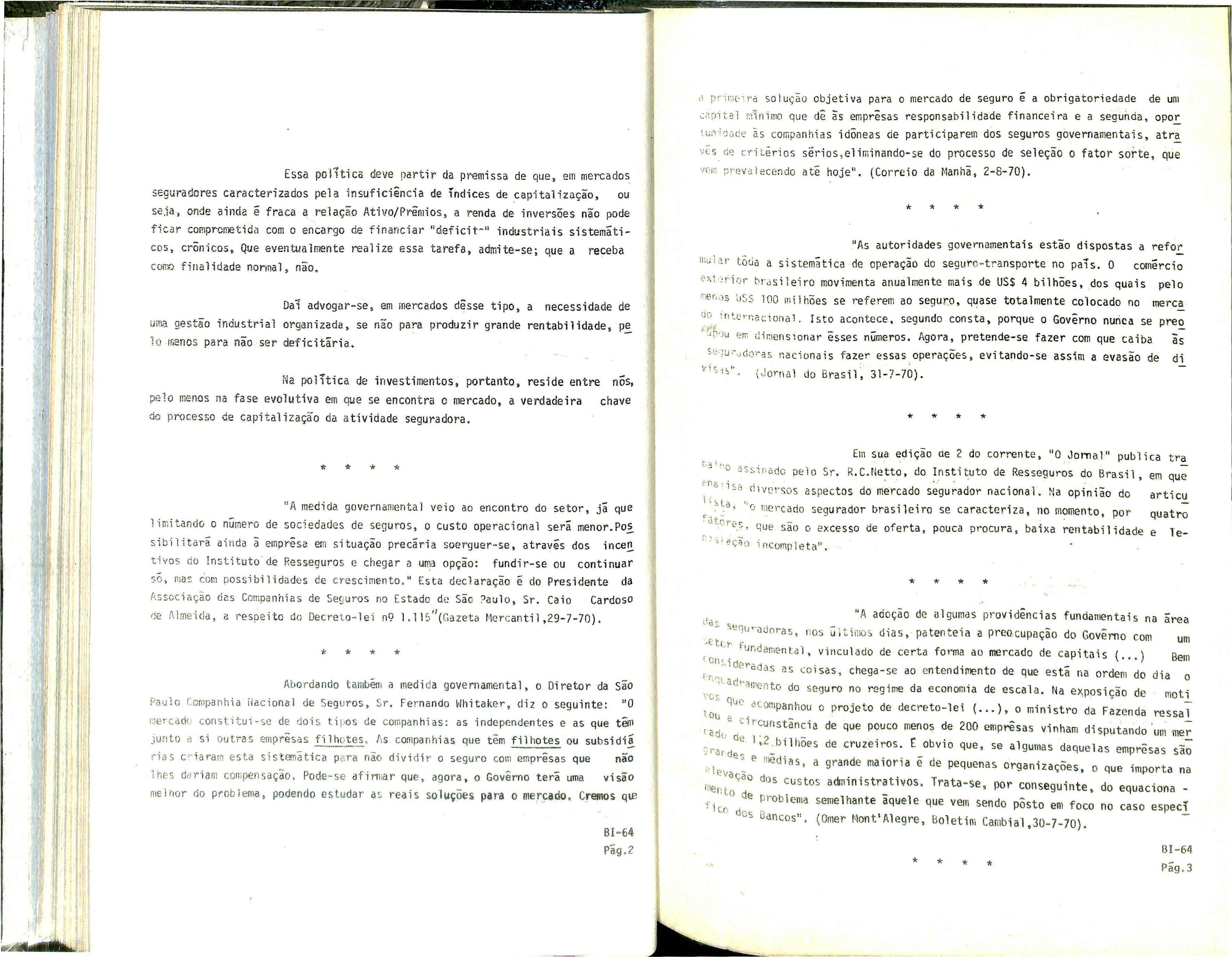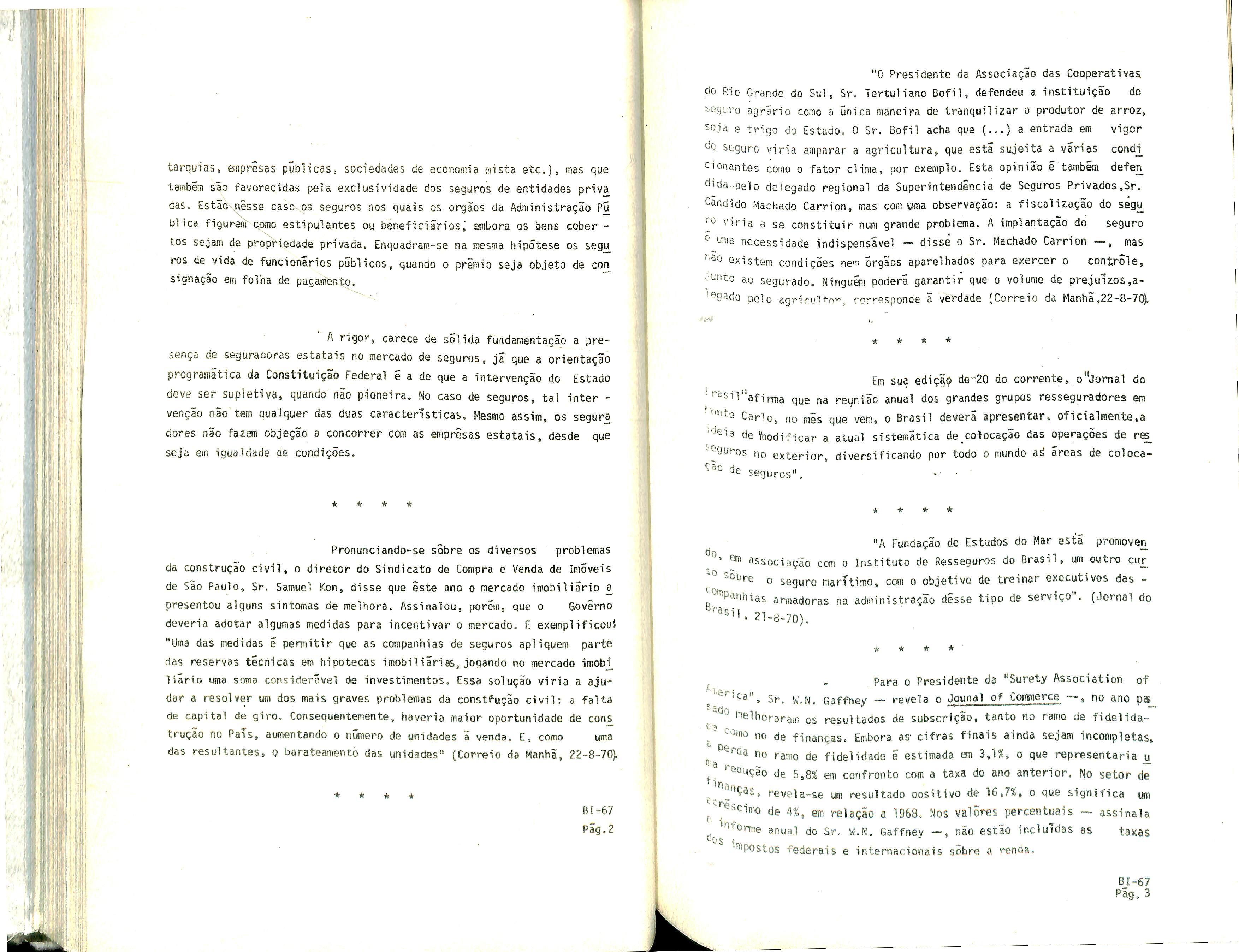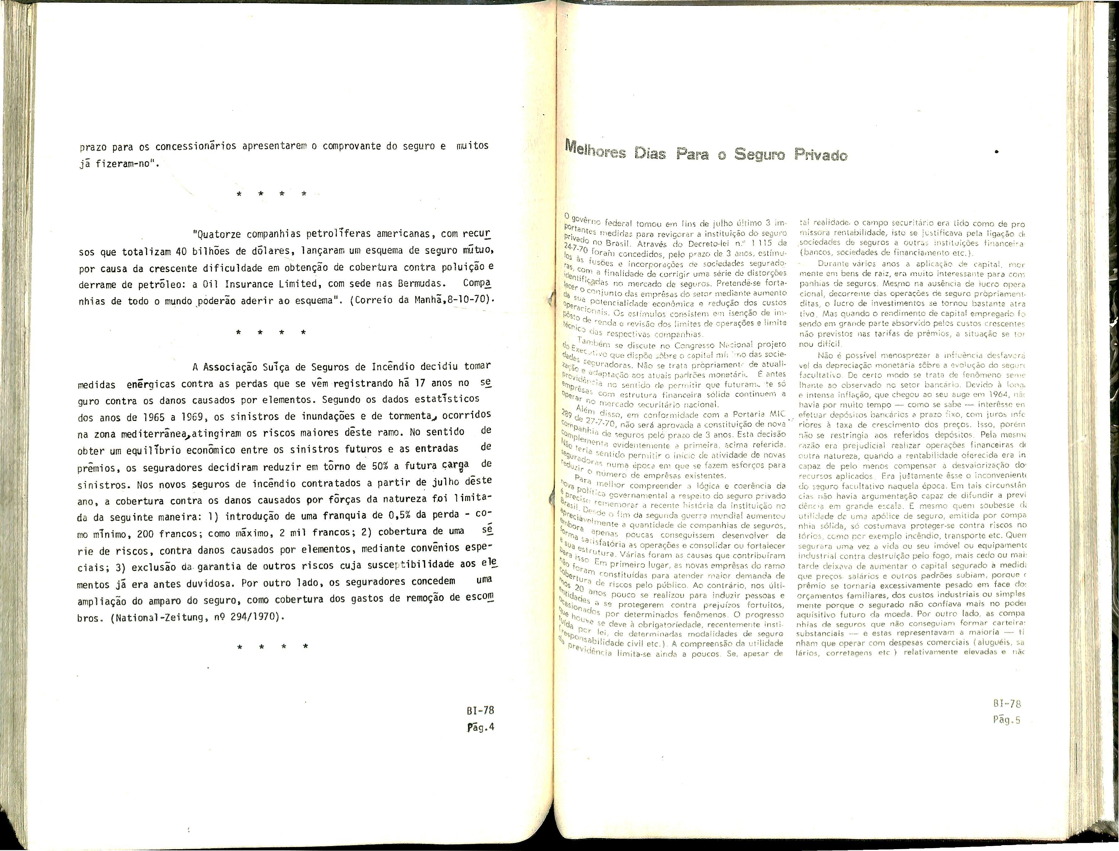 Os r esultados à e balanc o do mercado segurad or em J. 9 69, co nst it uiram-se em verd ad eira s urprêsa para us emp r esários e p a ra os ó rgãos do govê rno resp o ns á veis pelo setor Na ve rdacl i.: n ão h a via , a t é 31 óe d ezembw, <1 men or expec ta tiv a da s per_d as ocorr ida s e , pr üúc a mc.nie, general izad as Os re ultad o s p ositiv9S. d as aplicaç;<:ies mal deram pa ra çobrir os d.efcit s da operação, ta n to nas e m presas .: stra n gc irn s , como na s na~io na~S - Ent re es tas ~,, :::n~ }:· ~.:.is o.tmgidas, ex.-- Ámcn tc, a s grandes se gufaáoras. · D aí o pan o ra m a de 1970 , m arcado pe a pesq ui sa incess an te dos m otivos e ca usa s do ocorr ido.