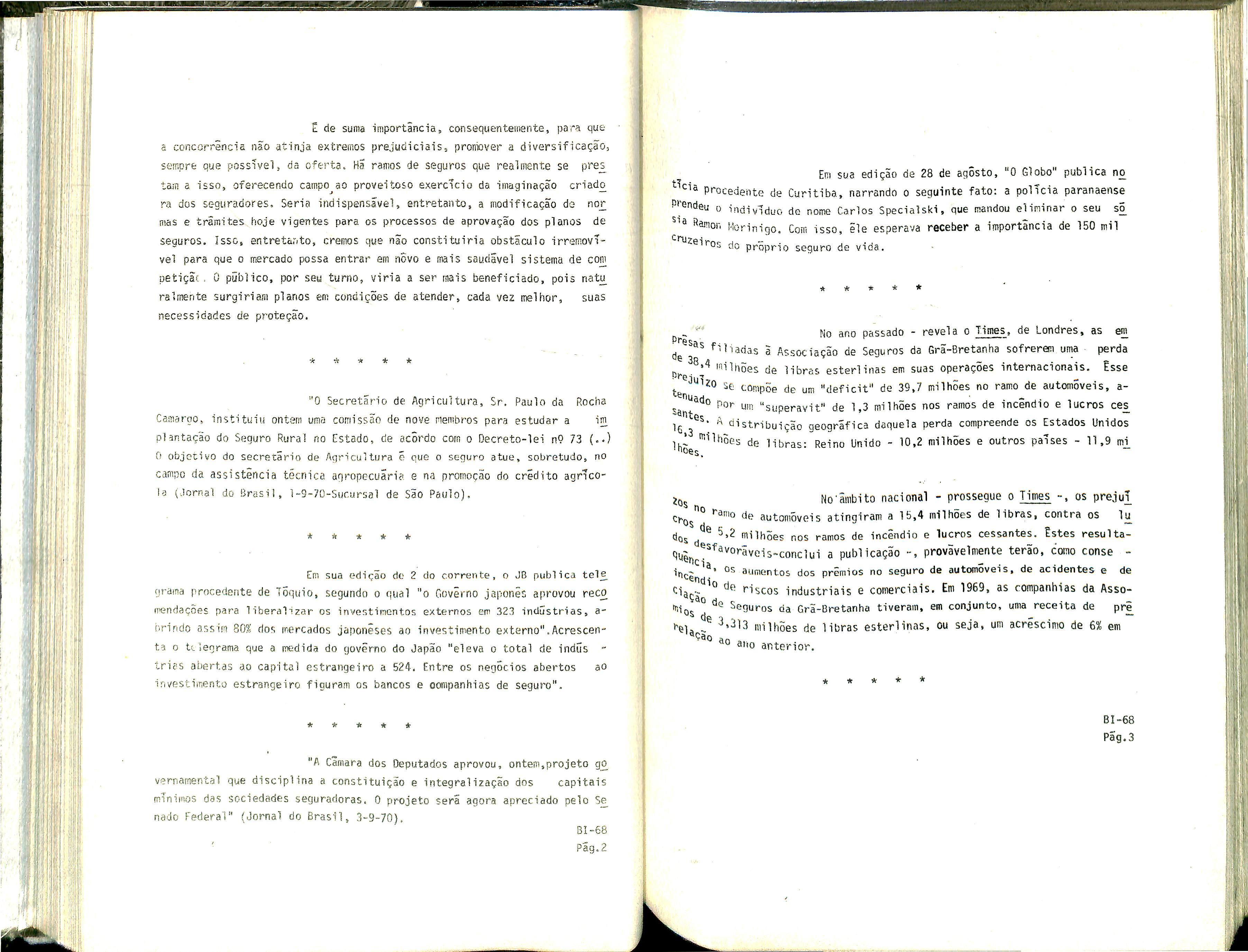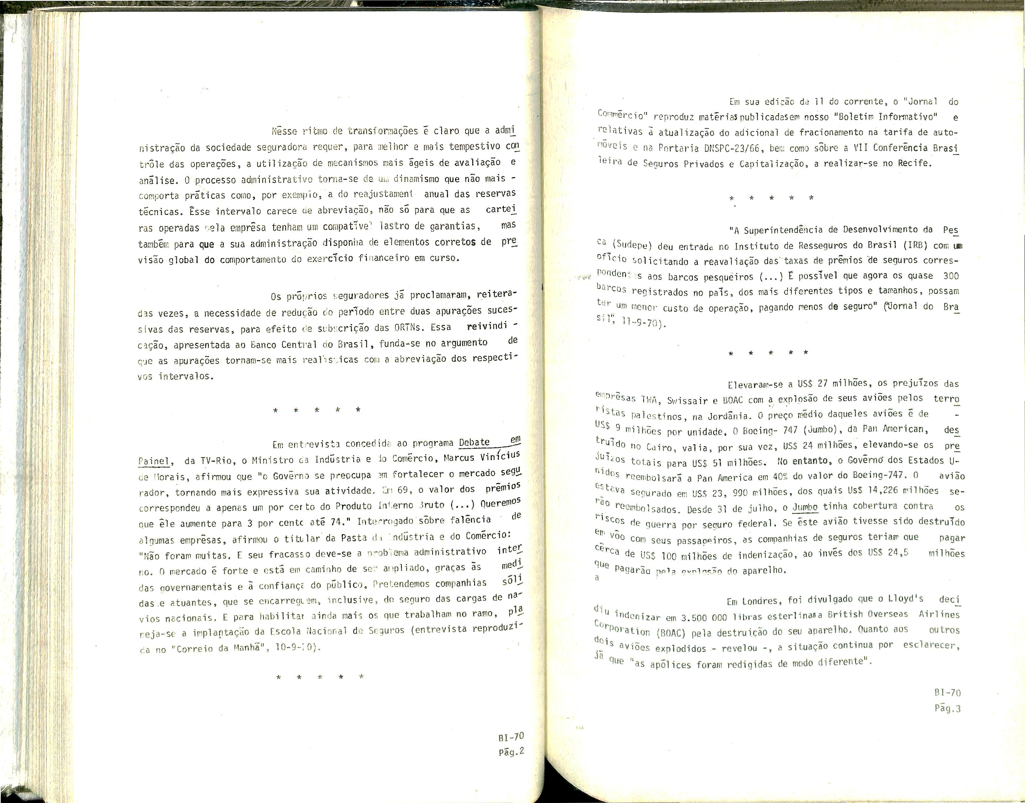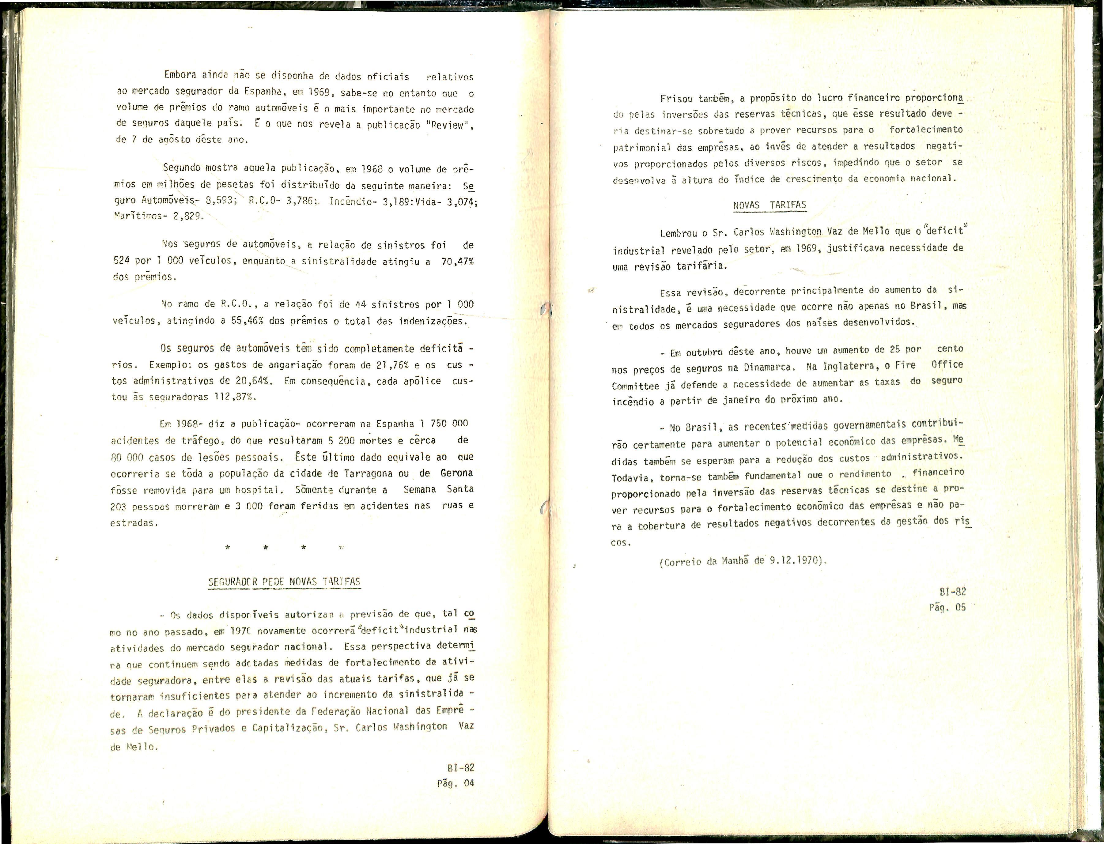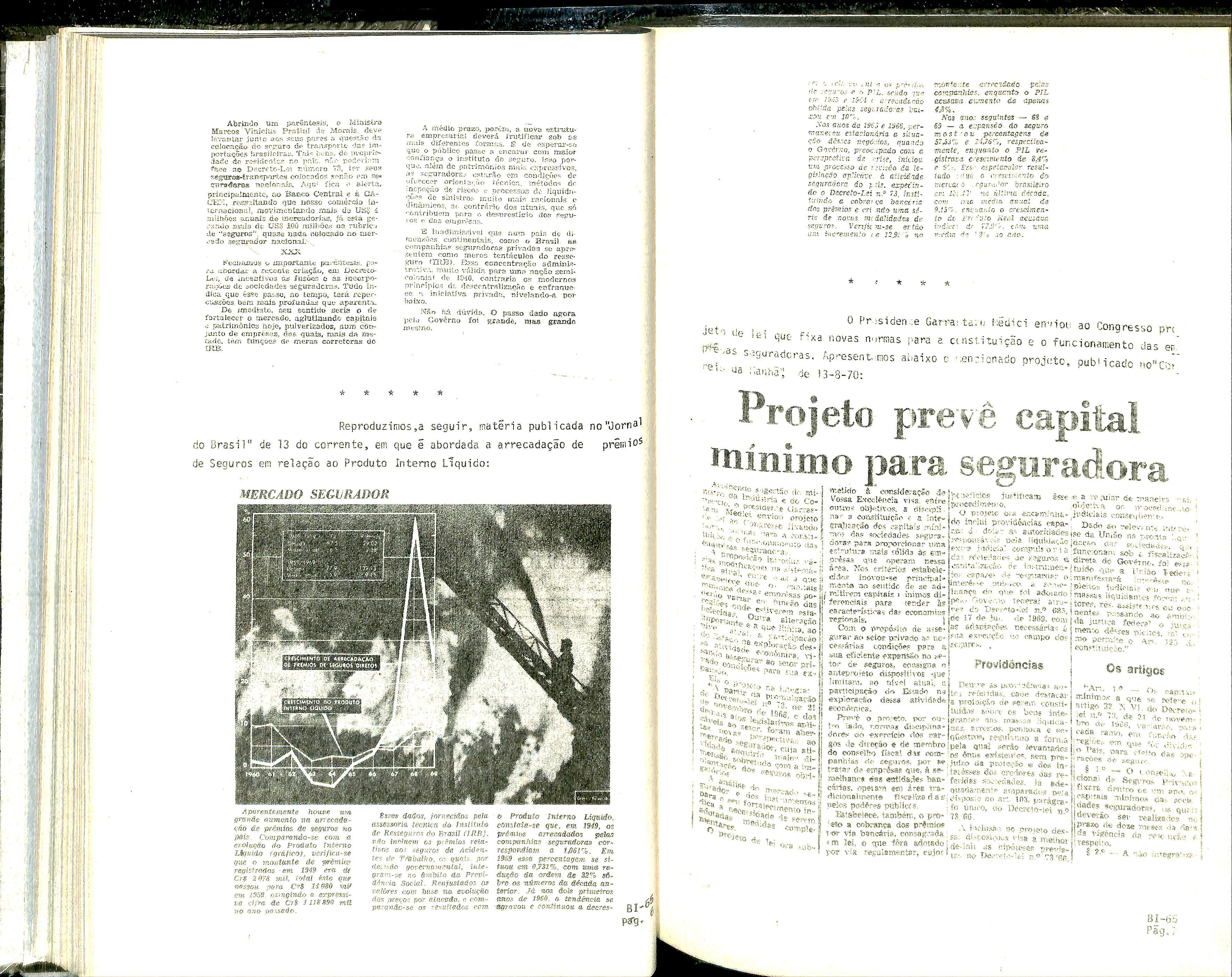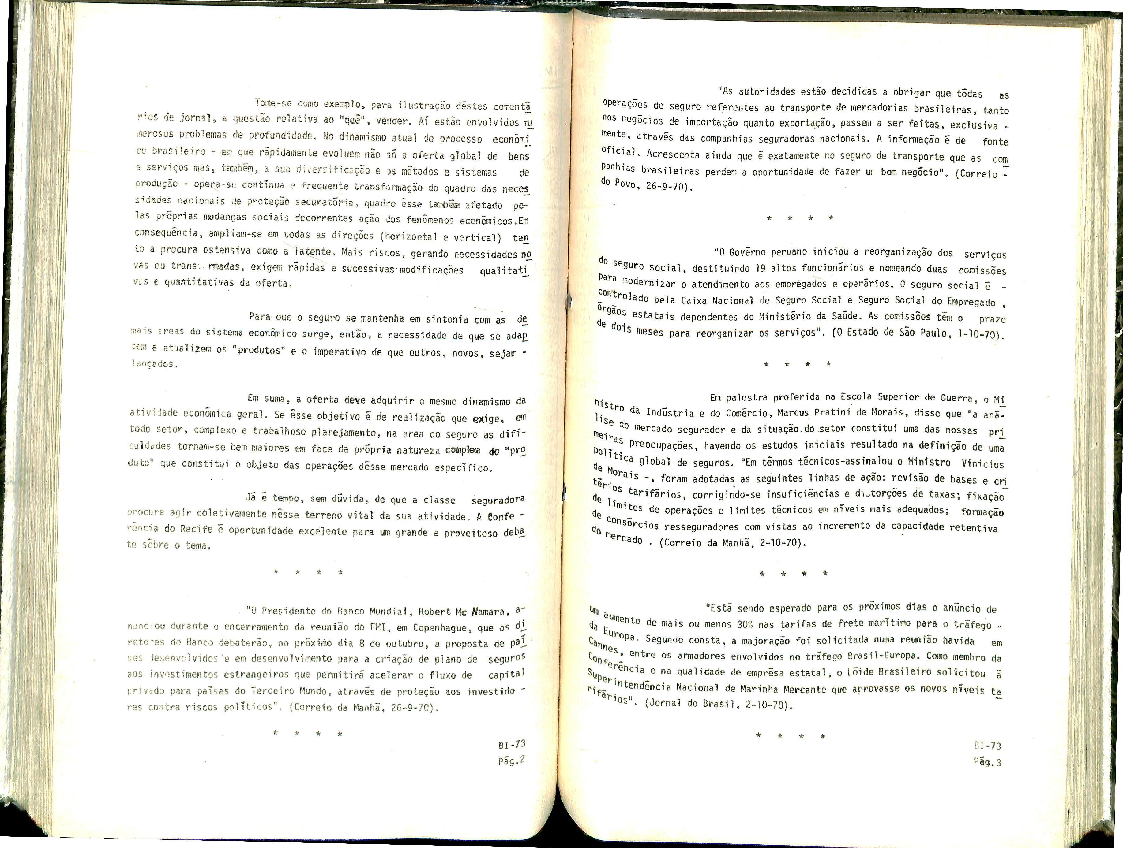 Os r esultados à e balanc o do mercado segurad or em J. 9 69, co nst it uiram-se em verd ad eira s urprêsa para us emp r esários e p a ra os ó rgãos do govê rno resp o ns á veis pelo setor Na ve rdacl i.: n ão h a via , a t é 31 óe d ezembw, <1 men or expec ta tiv a da s per_d as ocorr ida s e , pr üúc a mc.nie, general izad as Os re ultad o s p ositiv9S. d as aplicaç;<:ies mal deram pa ra çobrir os d.efcit s da operação, ta n to nas e m presas .: stra n gc irn s , como na s na~io na~S - Ent re es tas ~,, :::n~ }:· ~.:.is o.tmgidas, ex.-- Ámcn tc, a s grandes se gufaáoras. · D aí o pan o ra m a de 1970 , m arcado pe a pesq ui sa incess an te dos m otivos e ca usa s do ocorr ido.