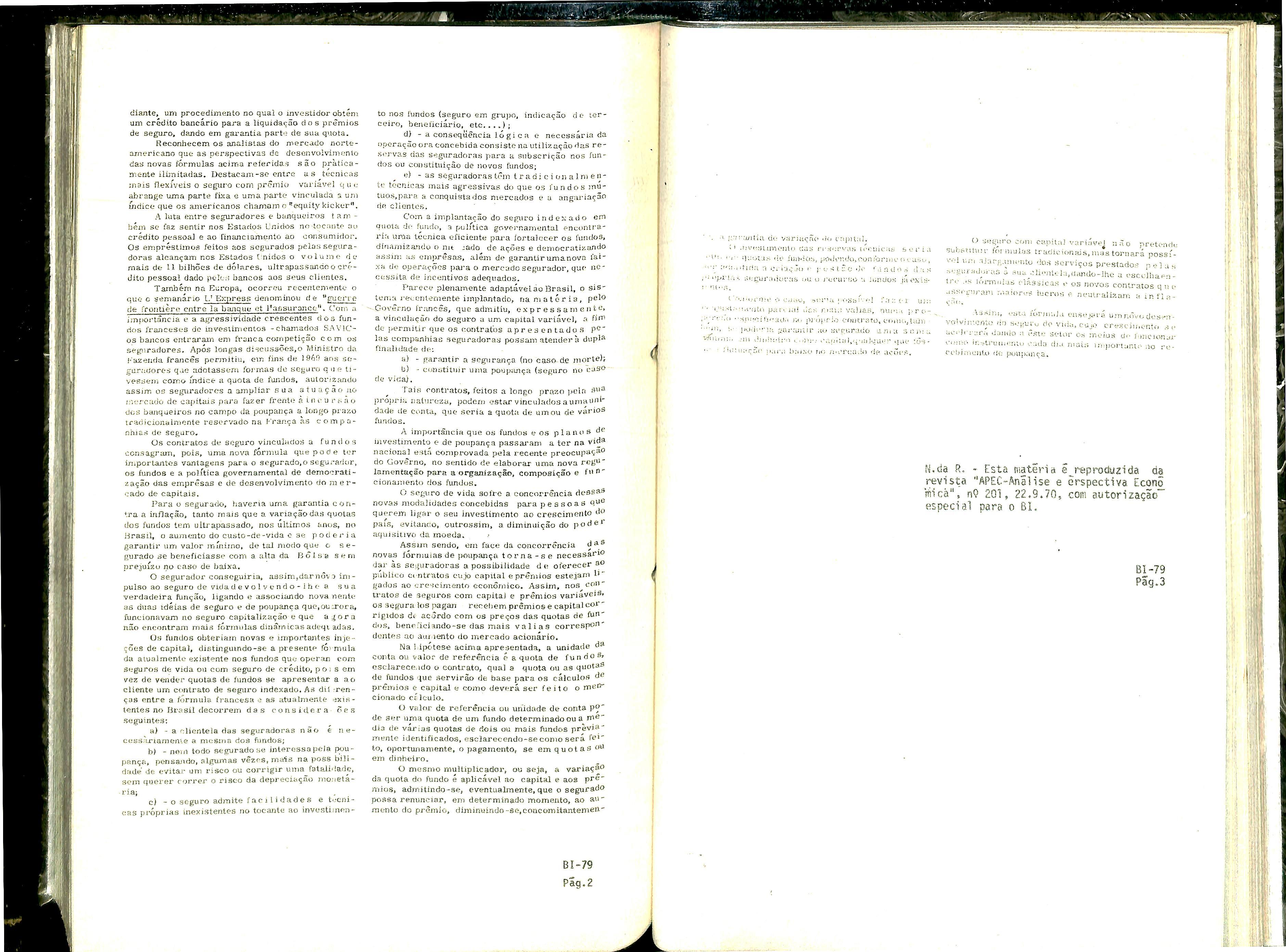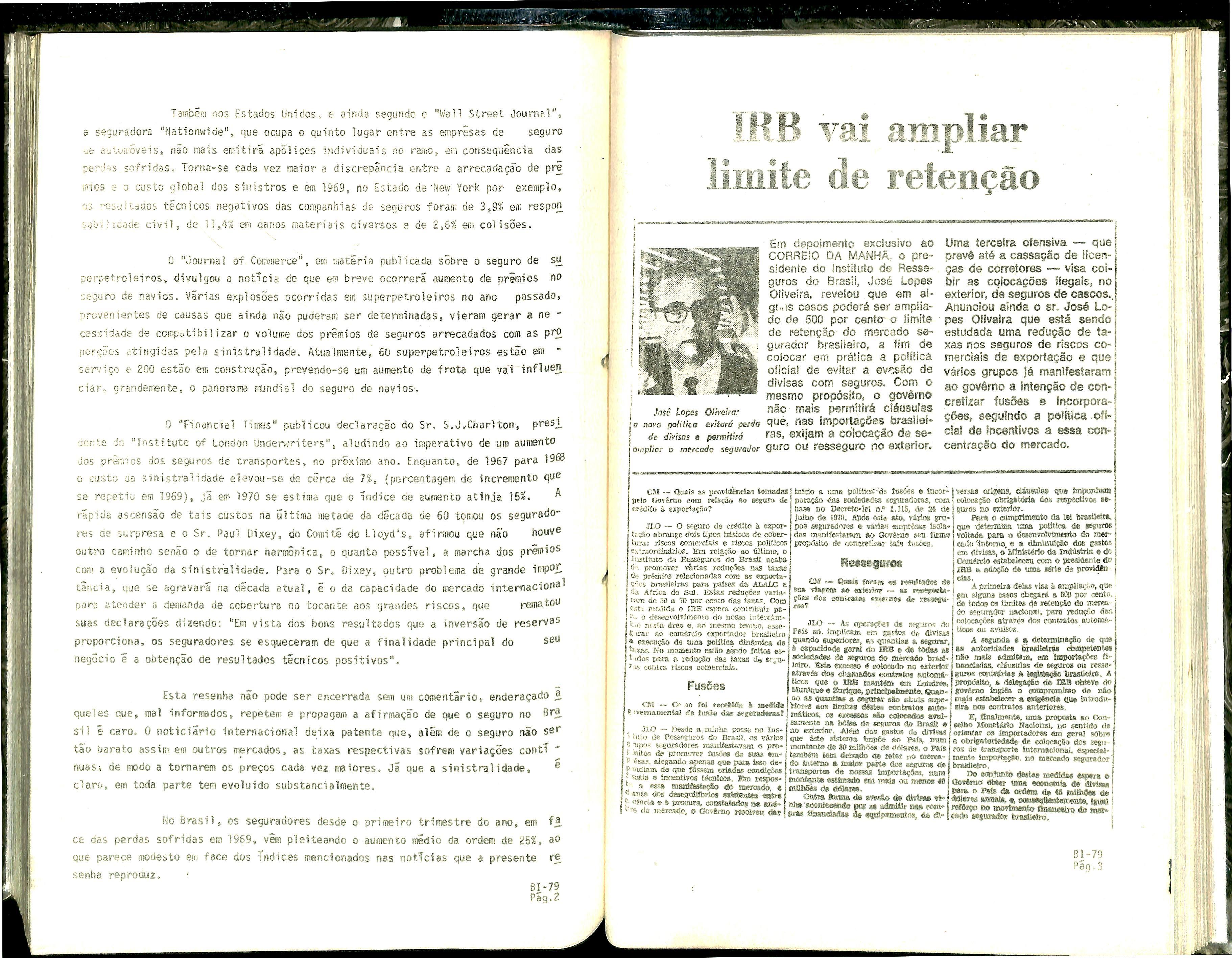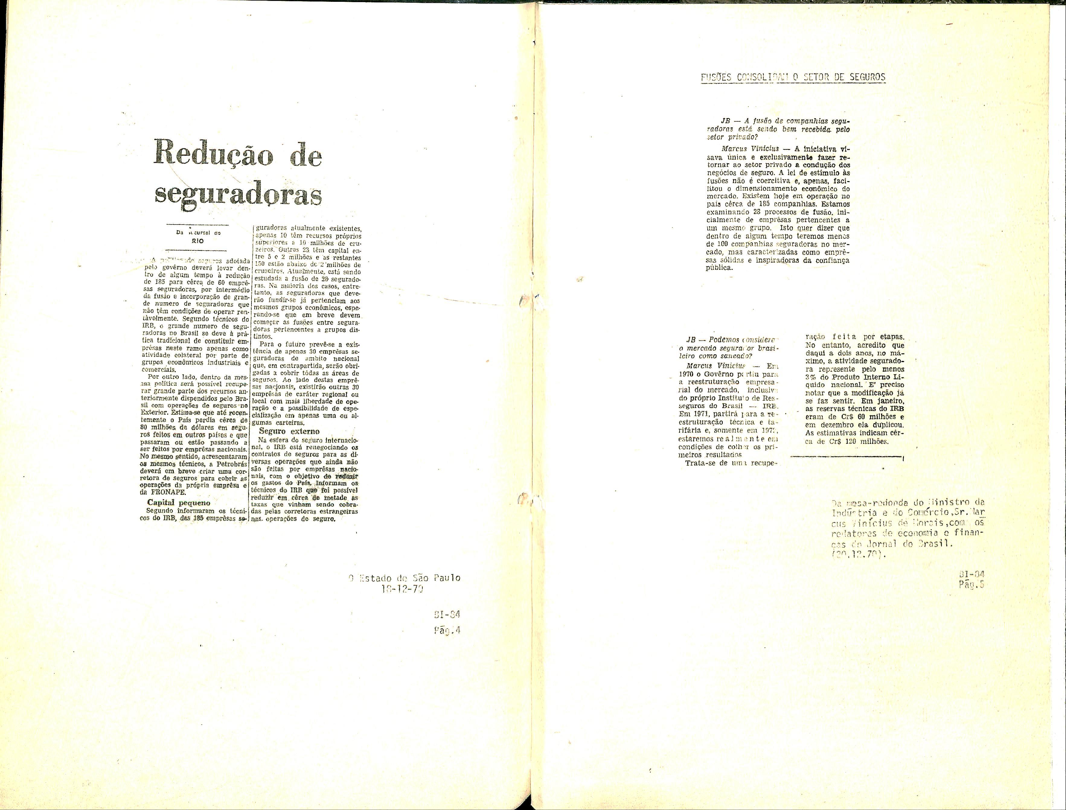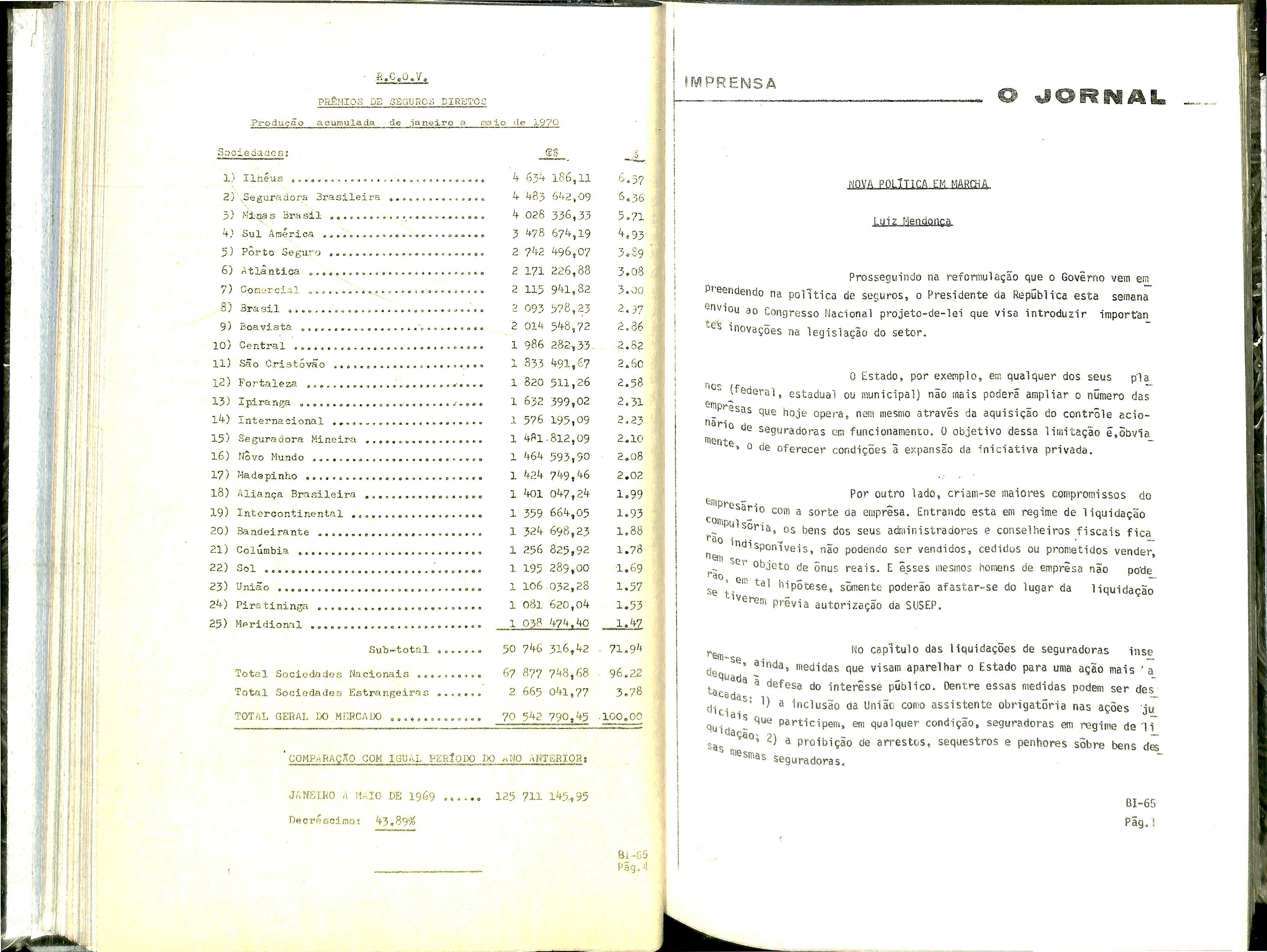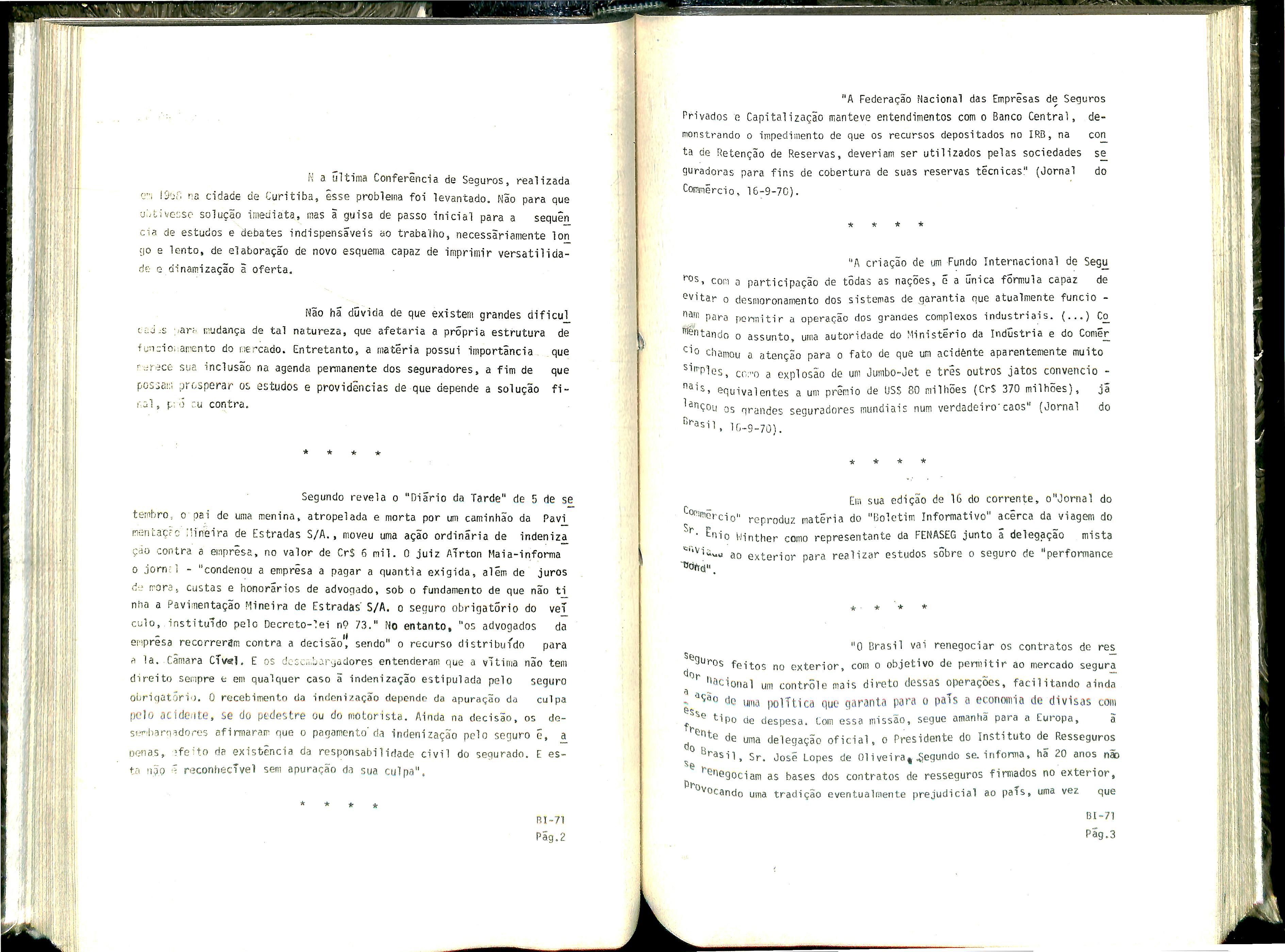 Os r esultados à e balanc o do mercado segurad or em J. 9 69, co nst it uiram-se em verd ad eira s urprêsa para us emp r esários e p a ra os ó rgãos do govê rno resp o ns á veis pelo setor Na ve rdacl i.: n ão h a via , a t é 31 óe d ezembw, <1 men or expec ta tiv a da s per_d as ocorr ida s e , pr üúc a mc.nie, general izad as Os re ultad o s p ositiv9S. d as aplicaç;<:ies mal deram pa ra çobrir os d.efcit s da operação, ta n to nas e m presas .: stra n gc irn s , como na s na~io na~S - Ent re es tas ~,, :::n~ }:· ~.:.is o.tmgidas, ex.-- Ámcn tc, a s grandes se gufaáoras. · D aí o pan o ra m a de 1970 , m arcado pe a pesq ui sa incess an te dos m otivos e ca usa s do ocorr ido.