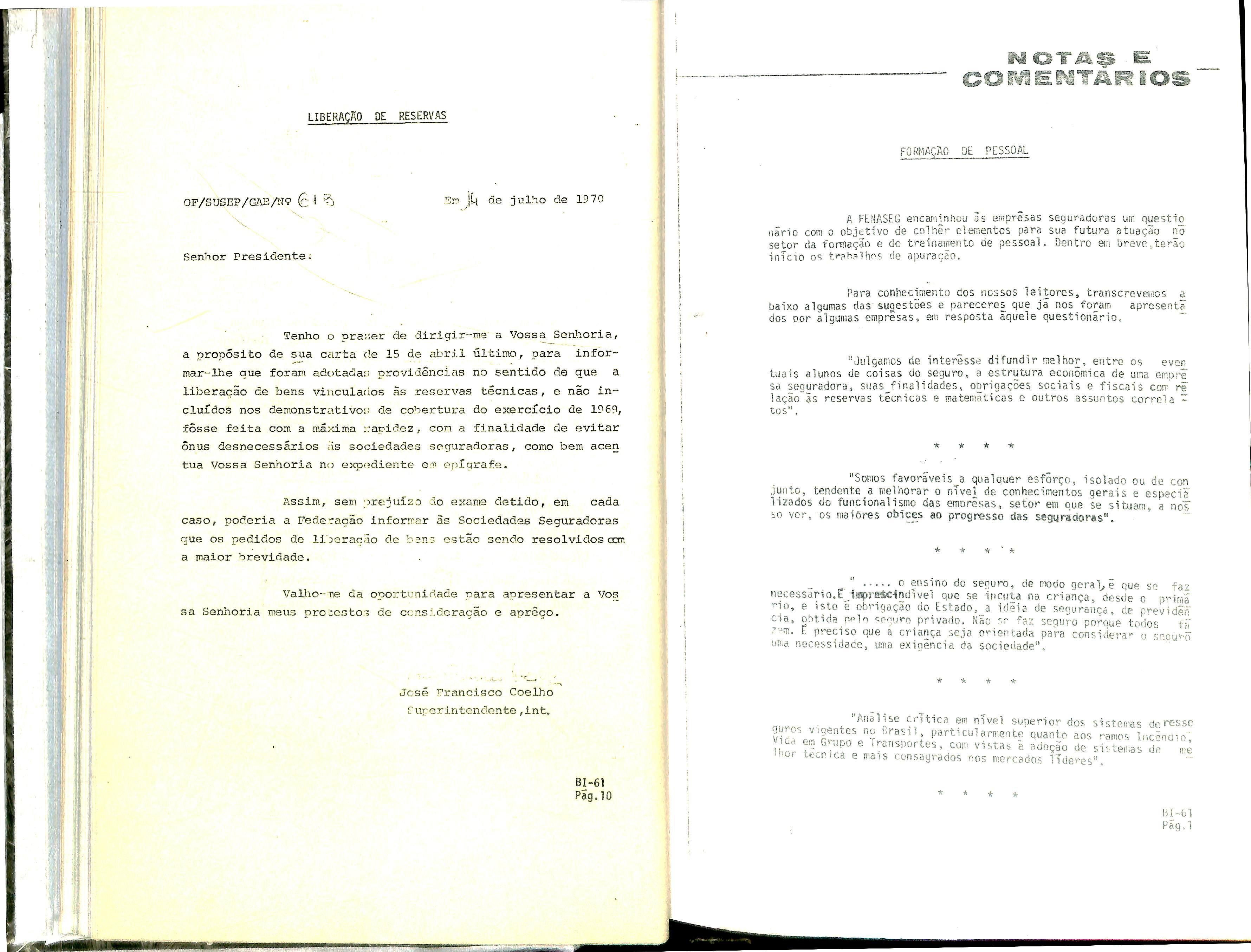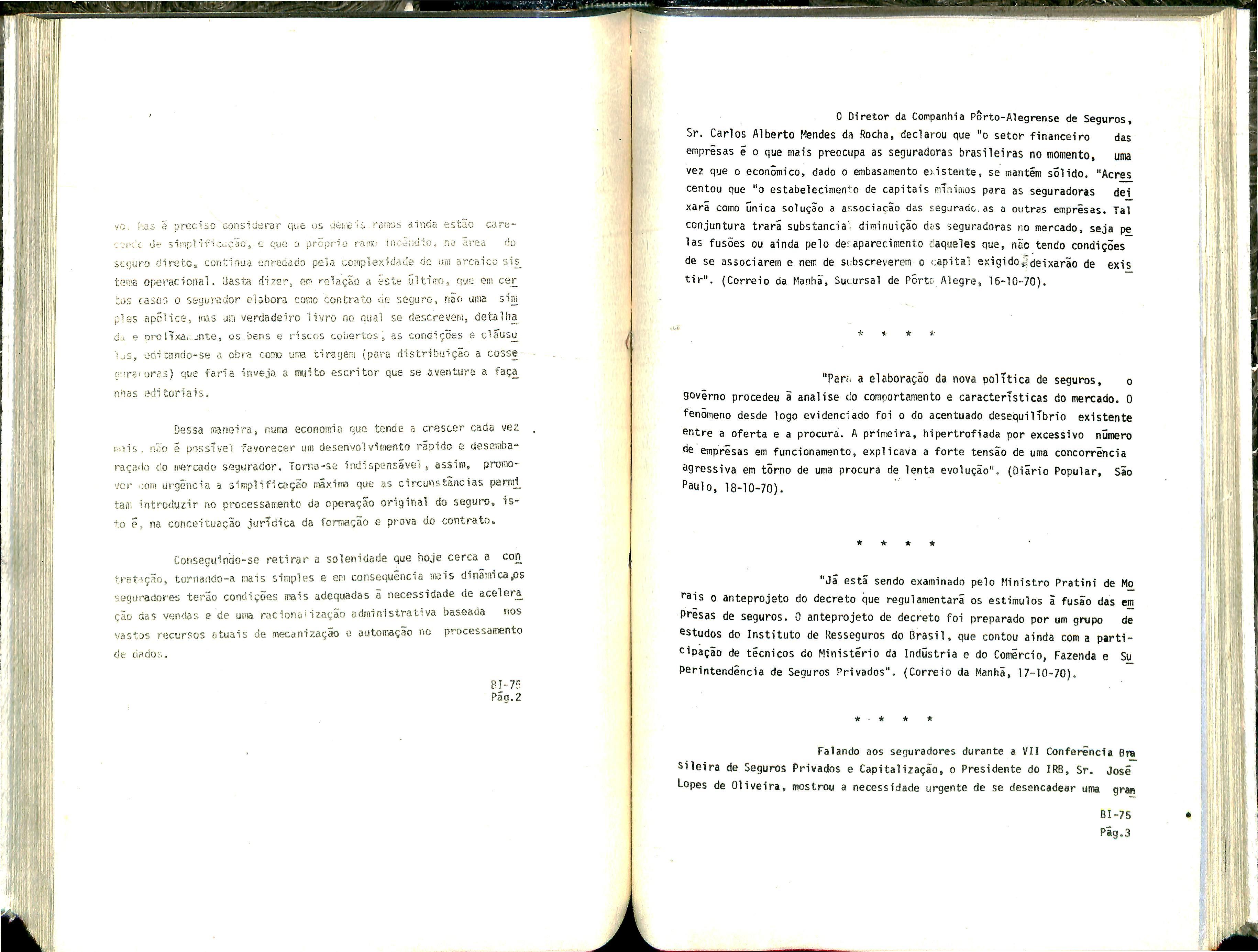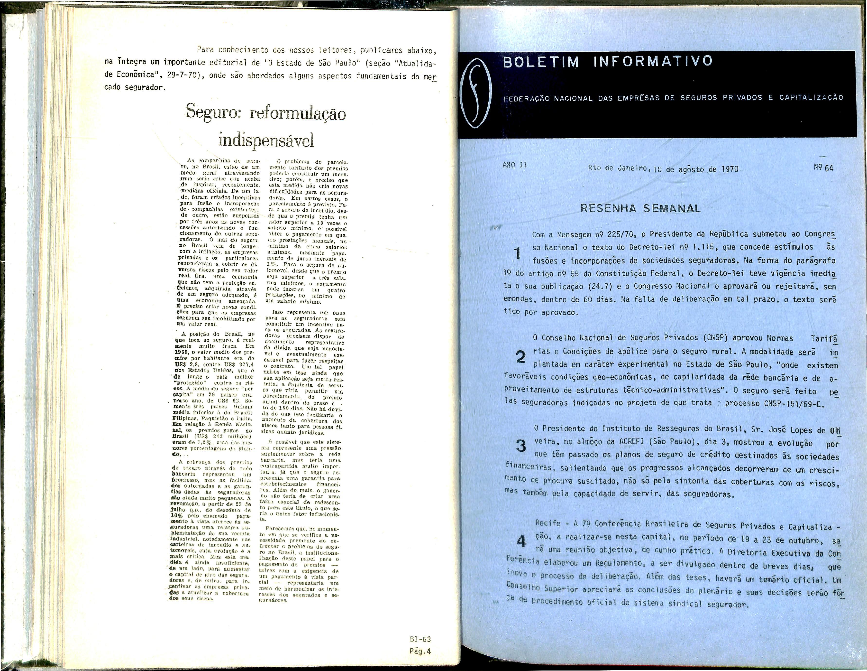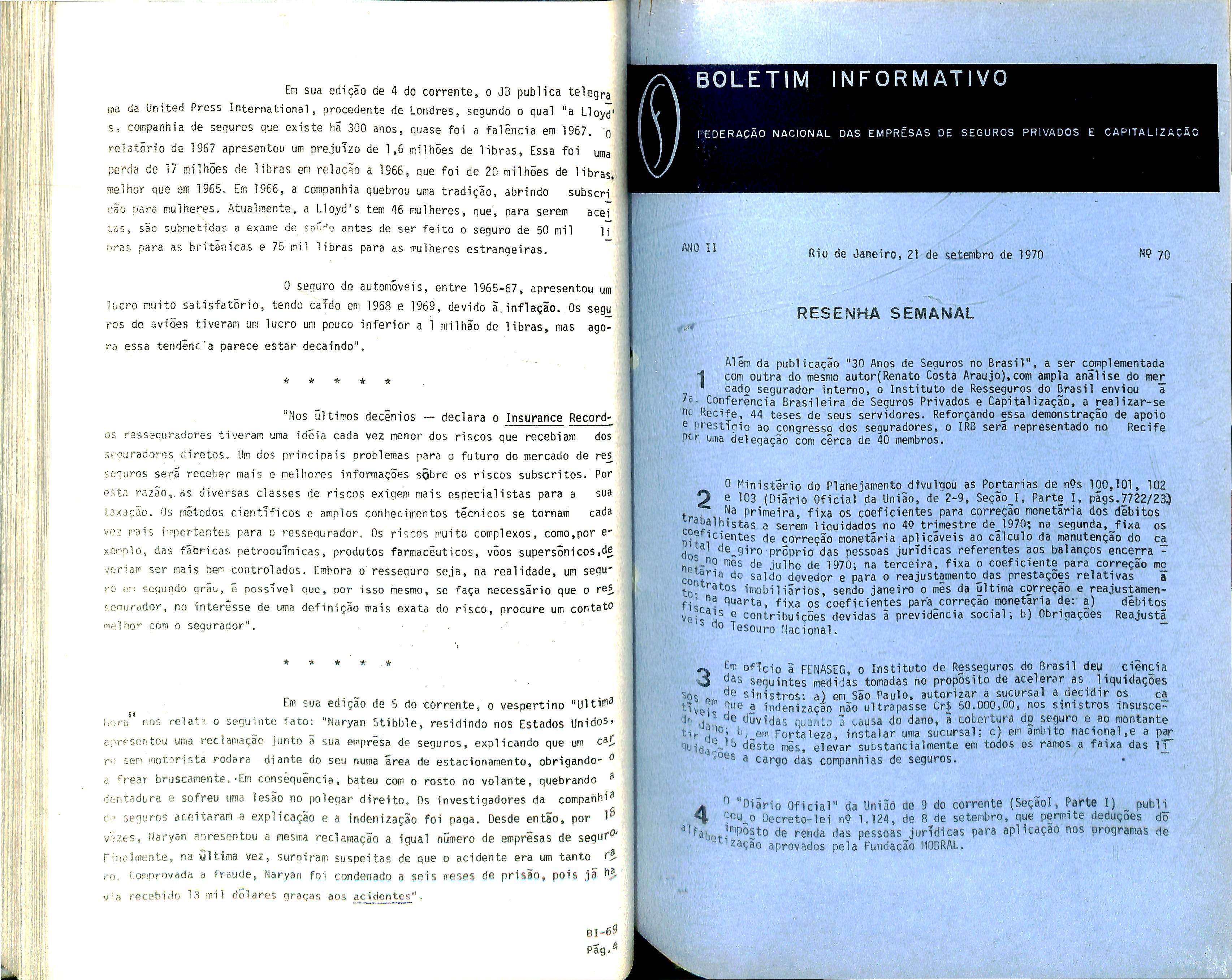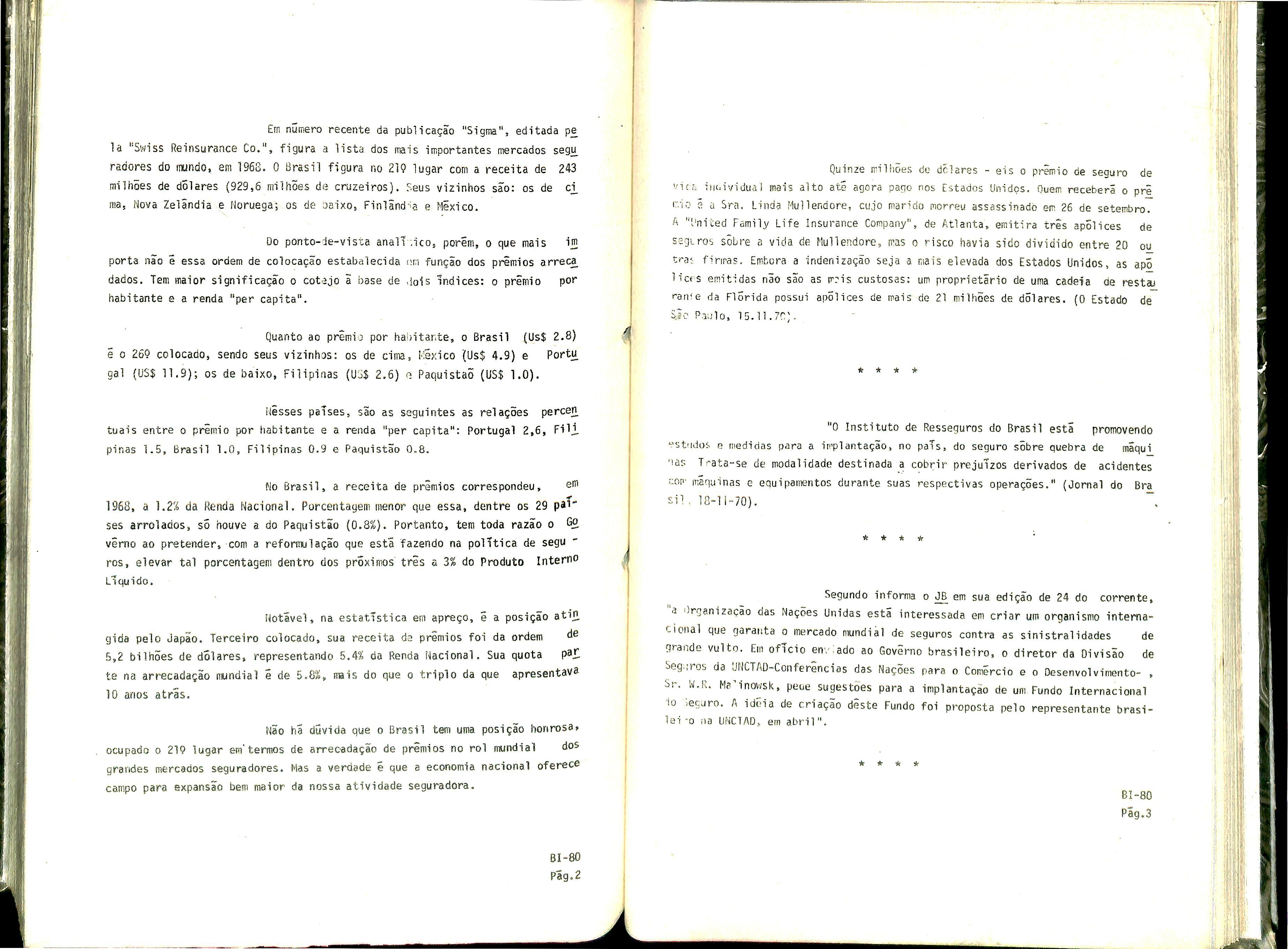 Os r esultados à e balanc o do mercado segurad or em J. 9 69, co nst it uiram-se em verd ad eira s urprêsa para us emp r esários e p a ra os ó rgãos do govê rno resp o ns á veis pelo setor Na ve rdacl i.: n ão h a via , a t é 31 óe d ezembw, <1 men or expec ta tiv a da s per_d as ocorr ida s e , pr üúc a mc.nie, general izad as Os re ultad o s p ositiv9S. d as aplicaç;<:ies mal deram pa ra çobrir os d.efcit s da operação, ta n to nas e m presas .: stra n gc irn s , como na s na~io na~S - Ent re es tas ~,, :::n~ }:· ~.:.is o.tmgidas, ex.-- Ámcn tc, a s grandes se gufaáoras. · D aí o pan o ra m a de 1970 , m arcado pe a pesq ui sa incess an te dos m otivos e ca usa s do ocorr ido.